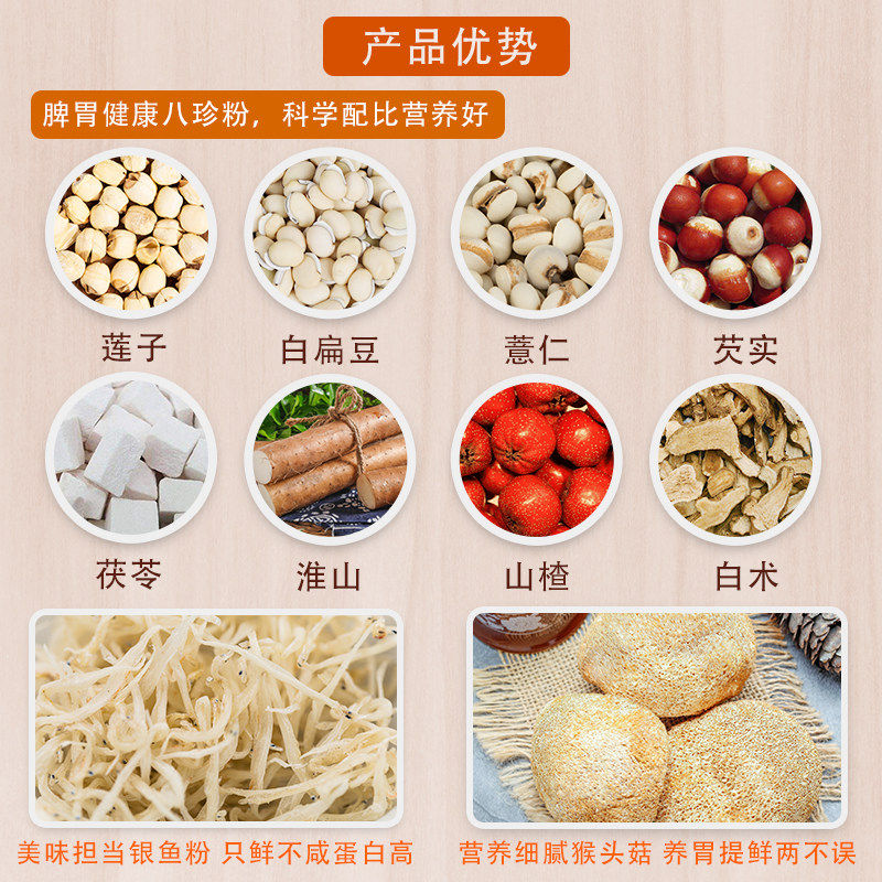 Children's Eight Treasures Powder Solid Poria Lotus Seed Huaishan Coix Kernel Lion's Head Mushroom Powder Silver Fish Powder Baby Supplement Recipes