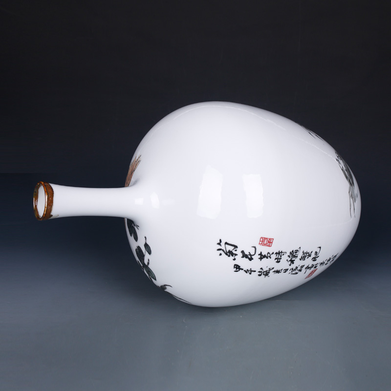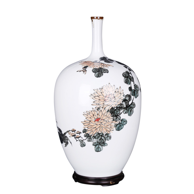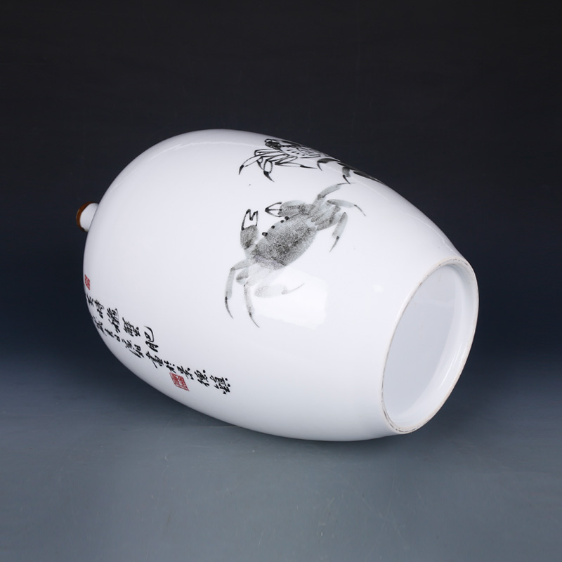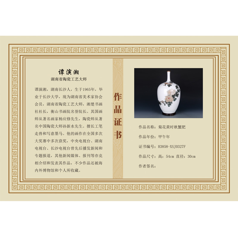 Hand-painted by Tan Yanxiang, a ceramic artist in Hunan Province, the chrysanthemum and yellow crabs have been fattened, and the vase decoration