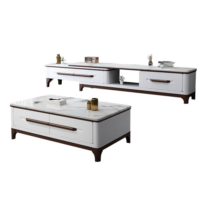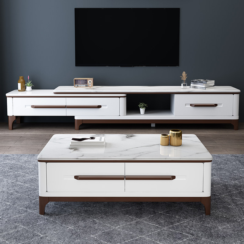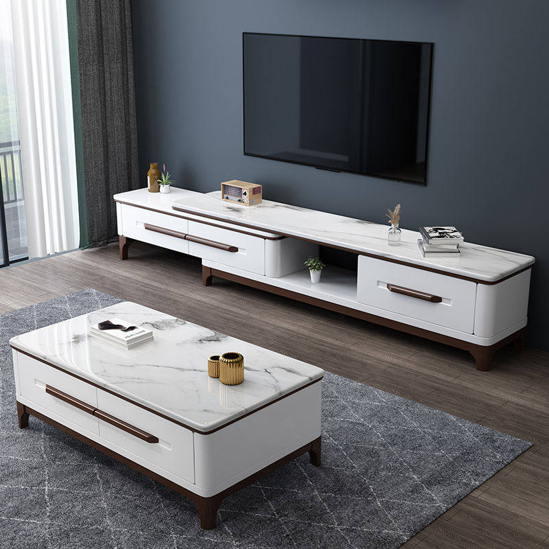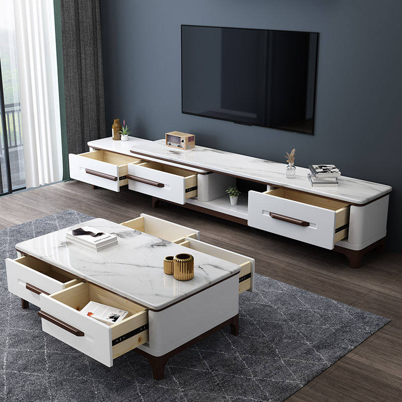 Marble tea table TV cabinet combination simple modern small apartment living room telescopic warm white tea table floor cabinet set