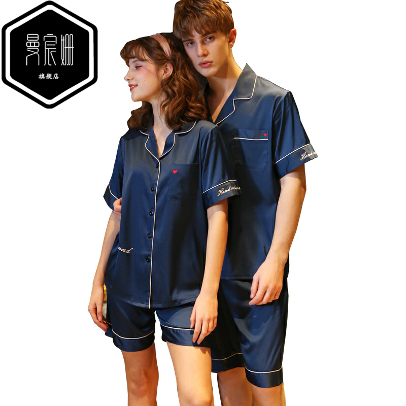 Tide brand high-end couple pajamas women's ice silk thin short-sleeved shorts two-piece men's loose women's silk home clothes