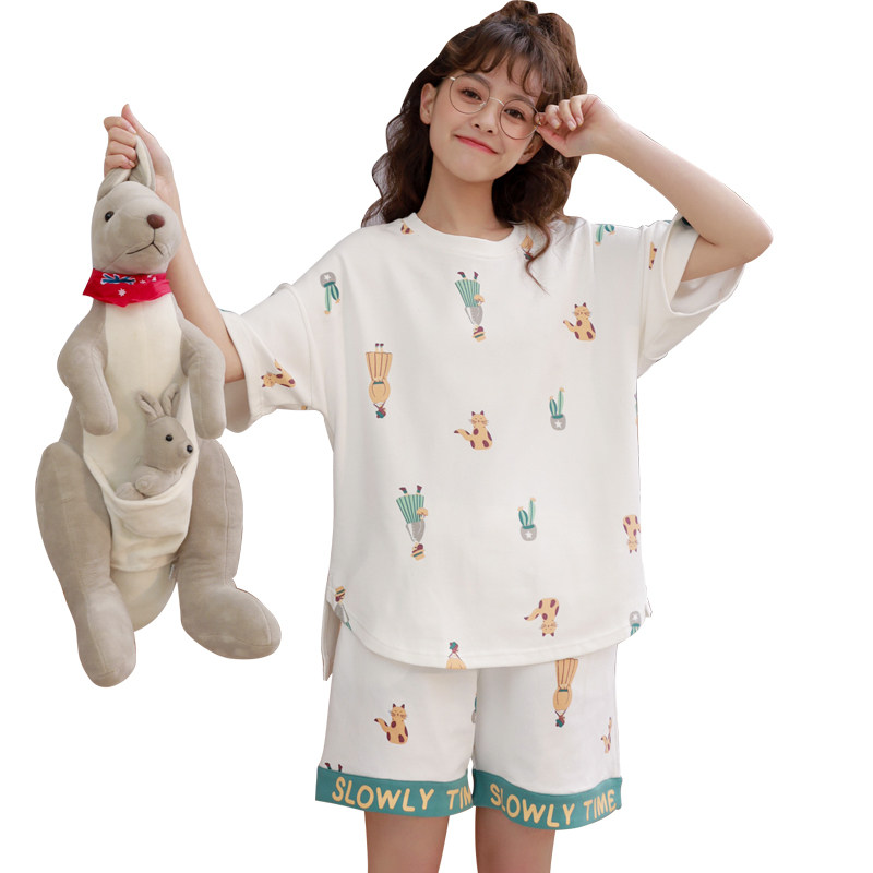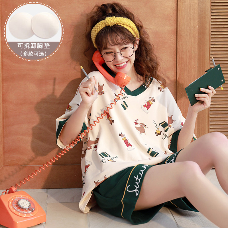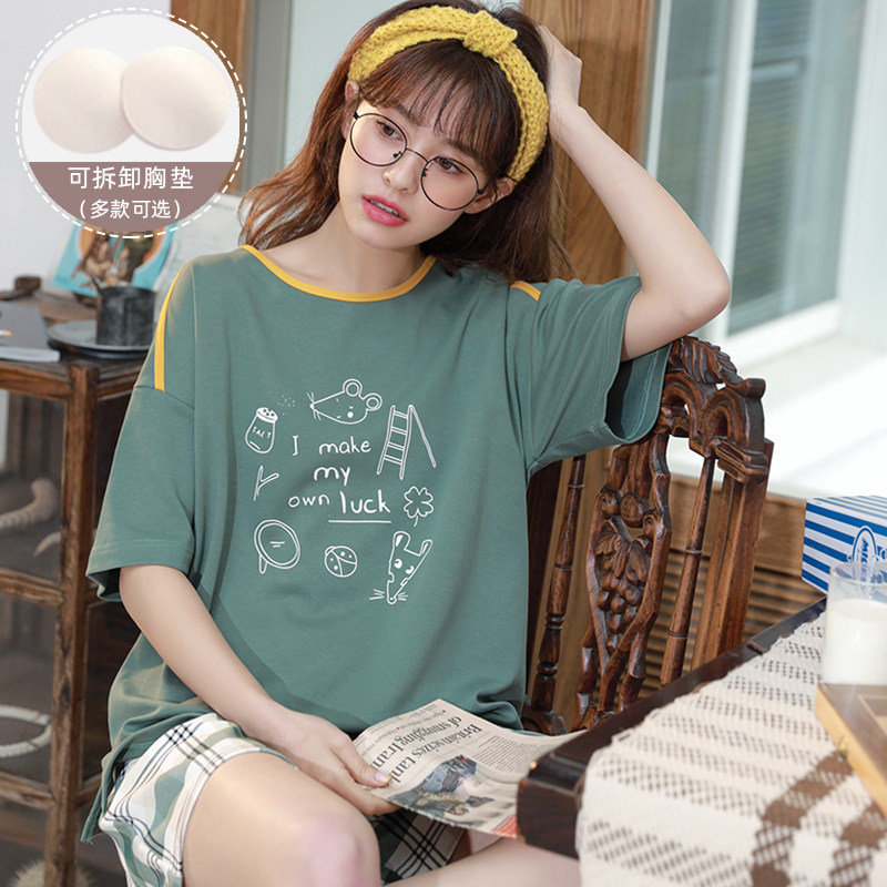 Bra pajamas with chest pad Women's summer pure cotton short-sleeved two-piece suit thin and loose can be worn outside spring and autumn home clothes