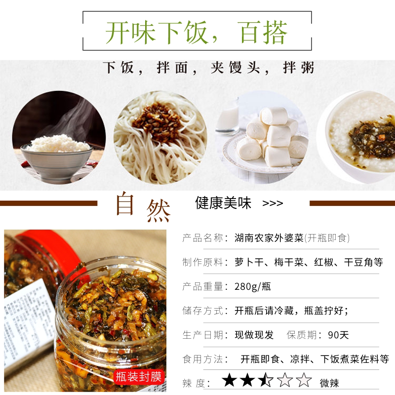 2 bottles of Hunan Granny cuisine Leftover Rice Dish specials Marinated with spicy open stomach plum dried vegetable sauce ready-to-eat 280g