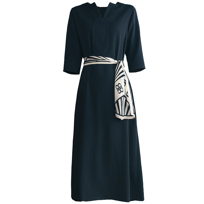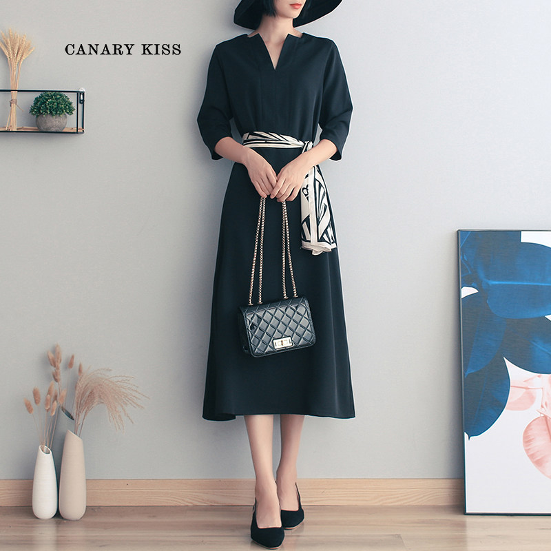 Canary Kiss black dress female summer French niche waist temperament V - fine seven - point tea break dress