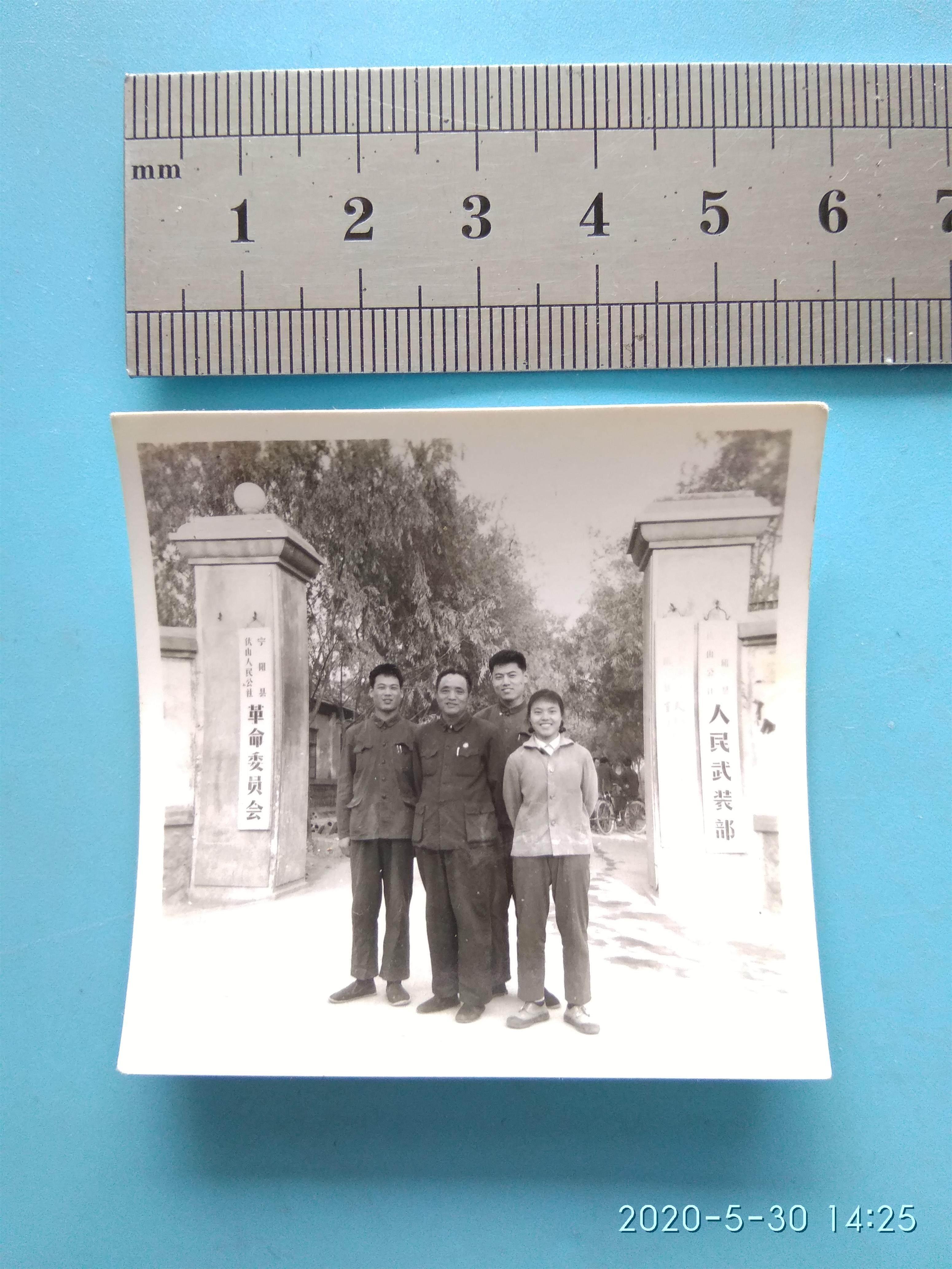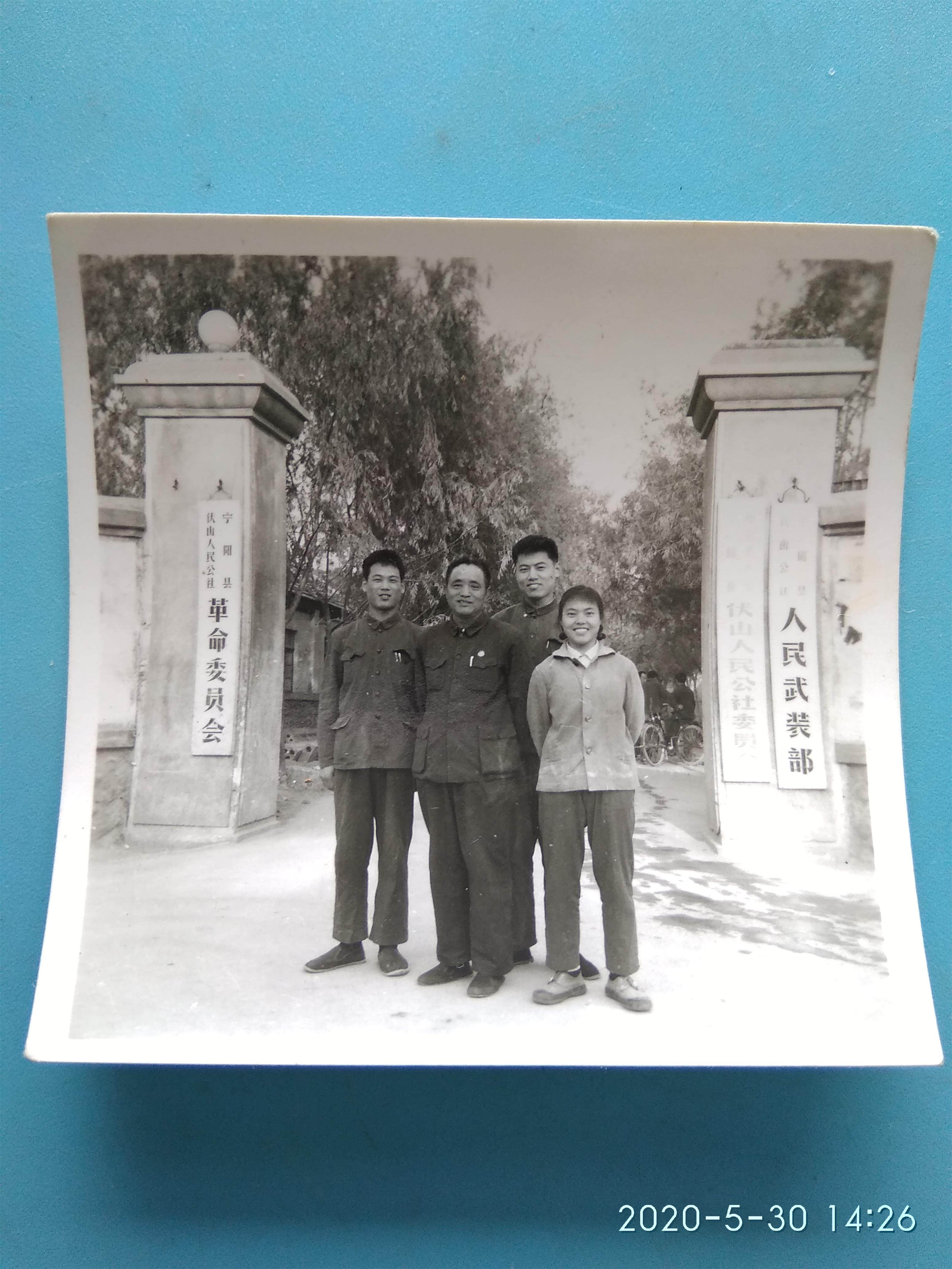 The old photo (of the People's Armed Ministry of the People's Armed Forces of Fushan People's Commune in Ningyang County) takes a group photo in front of the gate