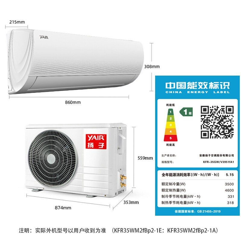 Yair Yangzi Air conditioning wall-mounted cold air Large 1 5 pip 1 pip 2 pip 3 pip warm up primary frequency conversion single cold wall-mounted power saving