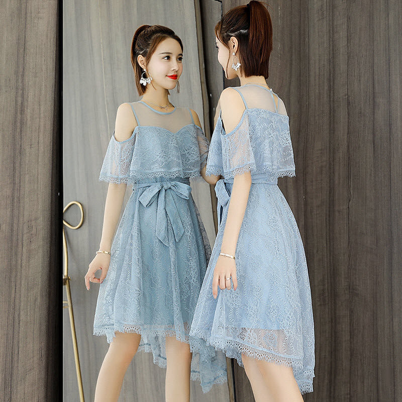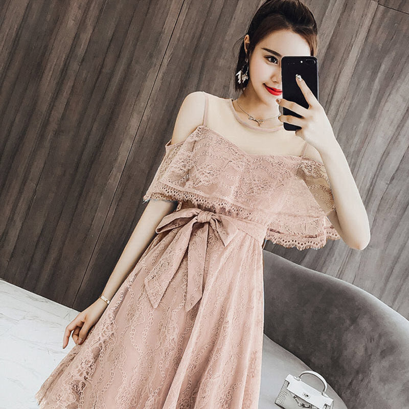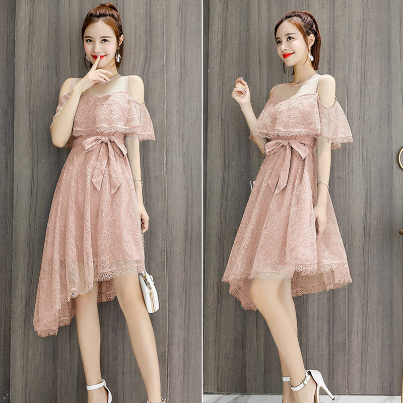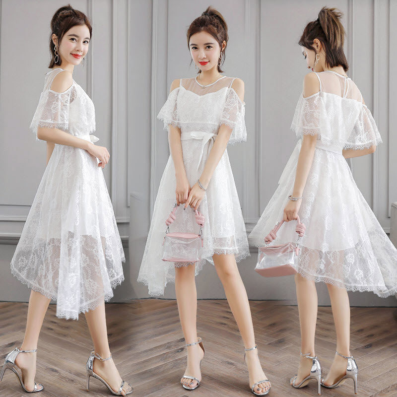 Water soluble lace dress Dress Dew Shoulder Super Fairy sexy hollowed-out summer cashew with thin temperament irregular knee skirt-Taobao