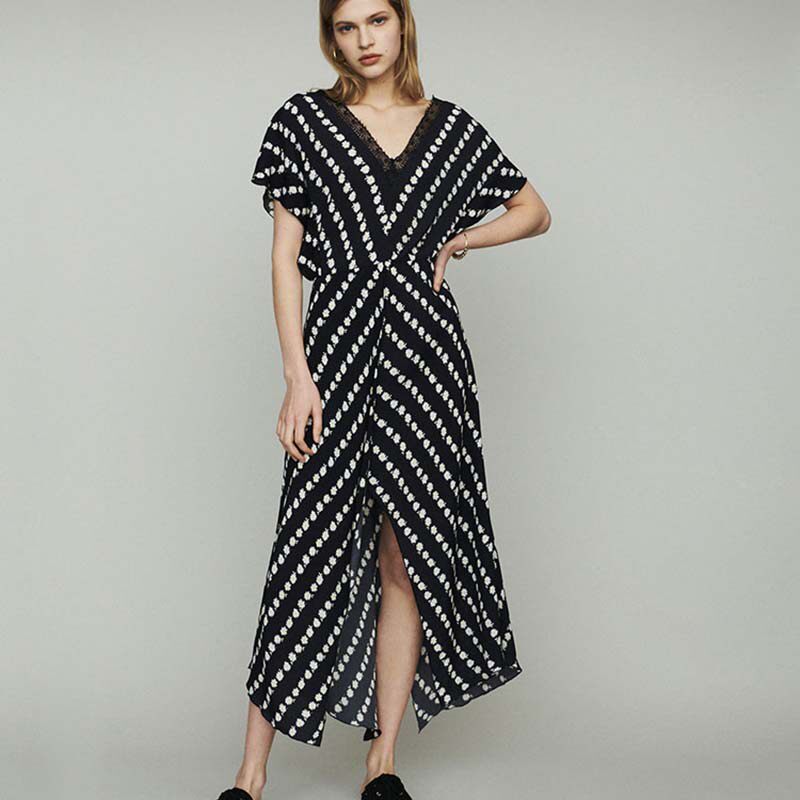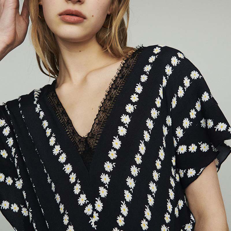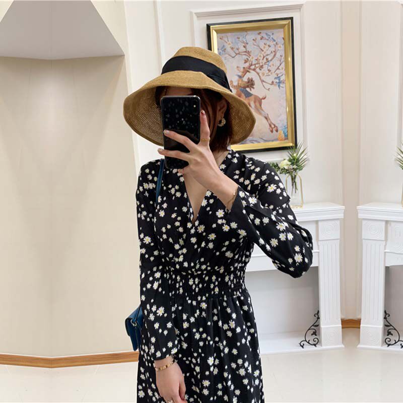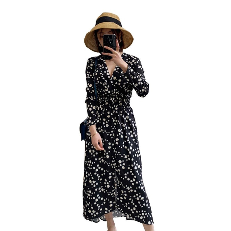 Ocean dress 2022 Summer style small daisy printed long sleeve sunscreen V collar temperament woman slim and tall version of skirt