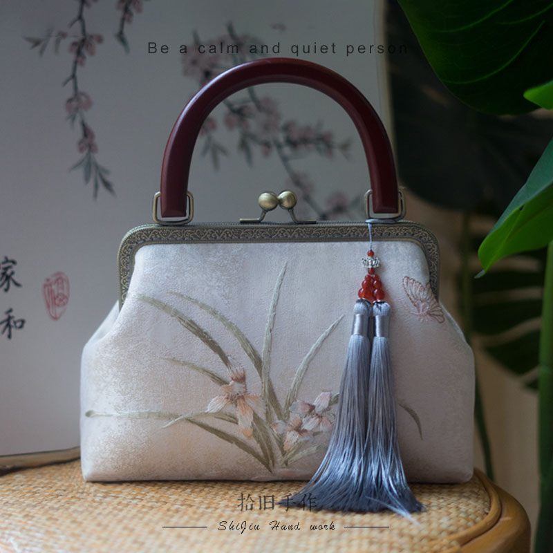 Orchid Bamboo Leaves Original Double-sided Embroidered Wooden Portable Qipao Bag Retro China Wind Lady 100 Hitch Elegant Embroidered Bag