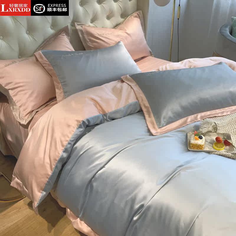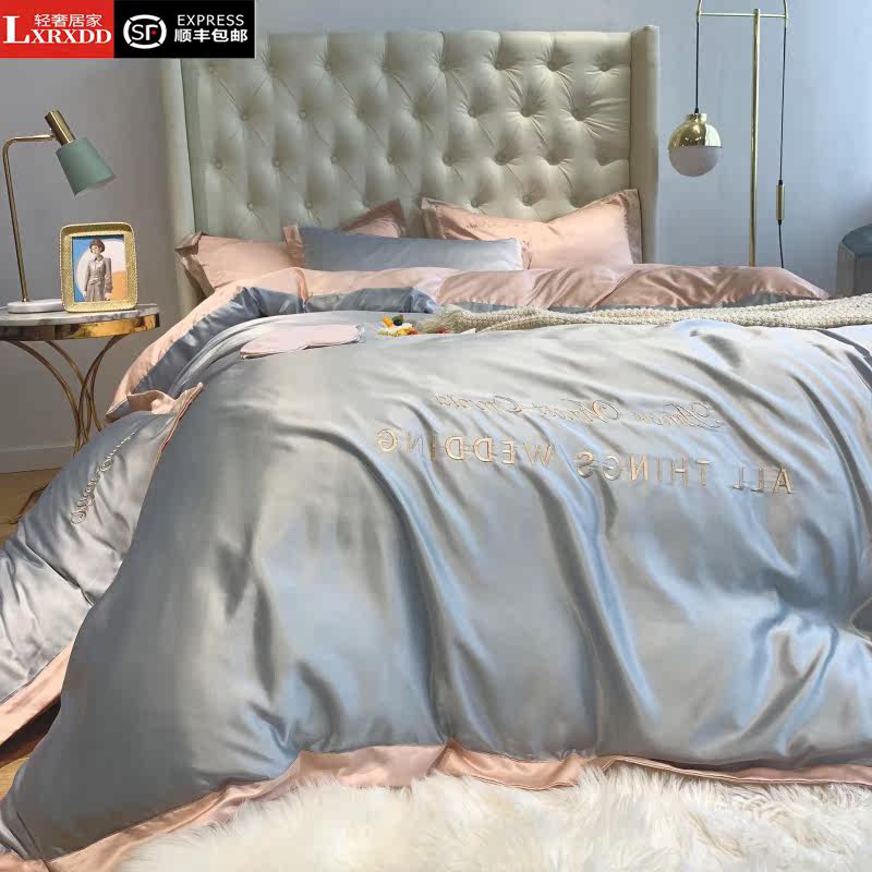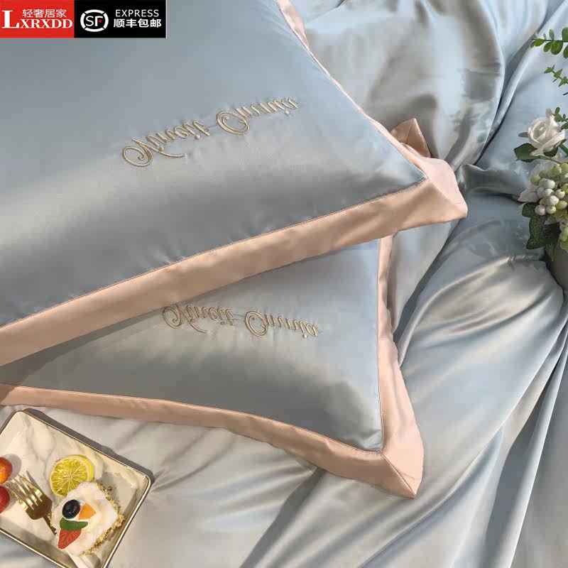 LXRXDD summer ice silk four-piece set Nordic light luxury bedding Summer bed single washed naked sleeping silk quilt cover