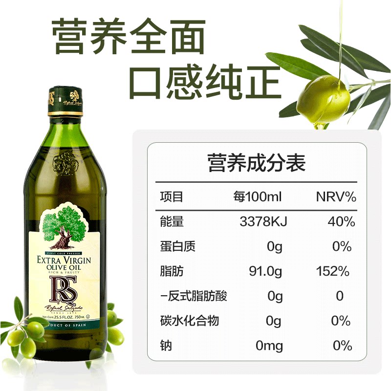Spanish import RS bottled special-grade extra-virgin olive oil 750ml small bottle Fitness Pure Delicious Fried Vegetable year stock