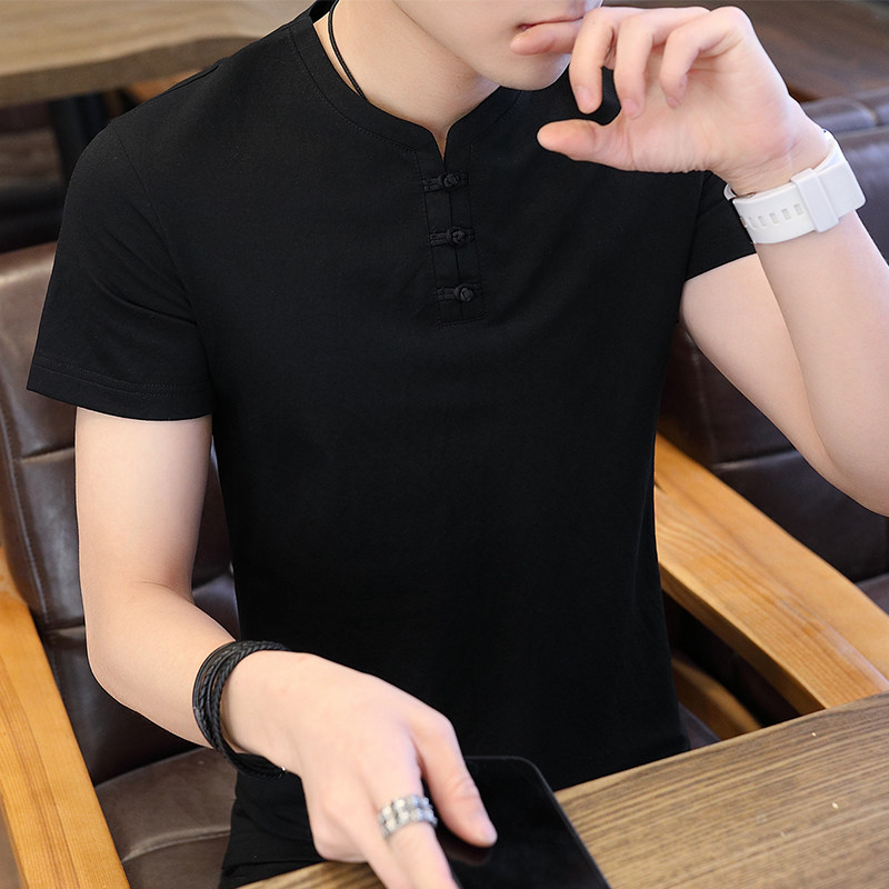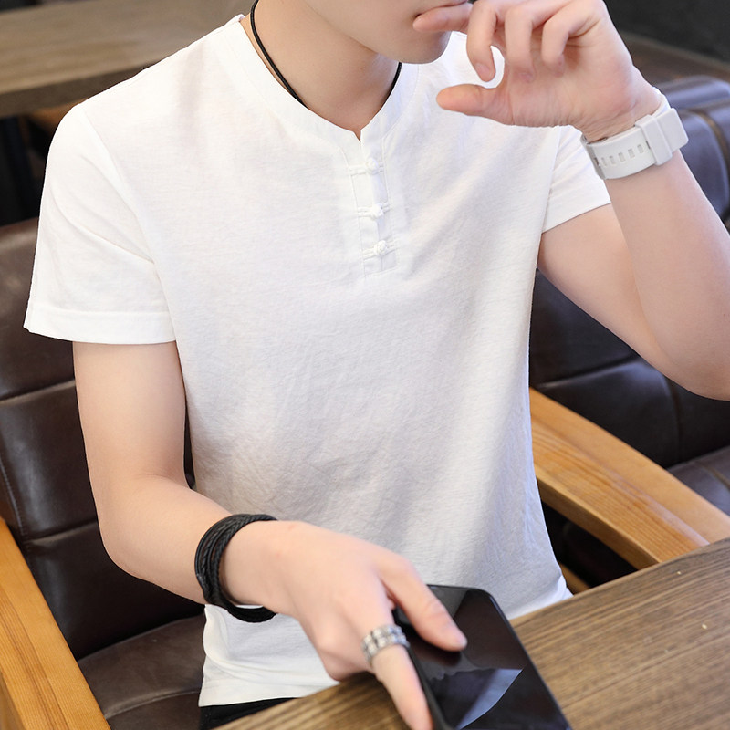 Rich bird Chinese style men's short-sleeved T-shirt tide brand cotton and hemp trend slim Korean version casual V-neck linen half-cut sleeves