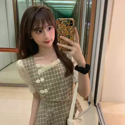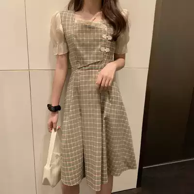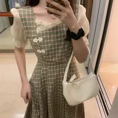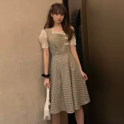 Large size women's French square collar waist dress dress cheongsam modified version fat mm belly thin Chinese style dress