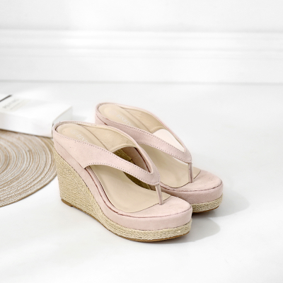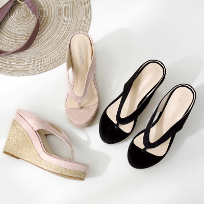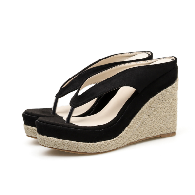 Beach slippers female summer herringbone dragging slopes with non-slip clamping feet seaside linen shoes straw thick bottom heels and sandals