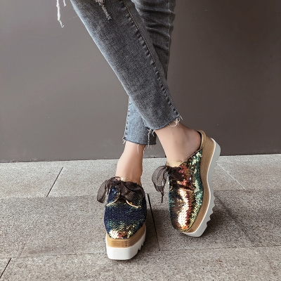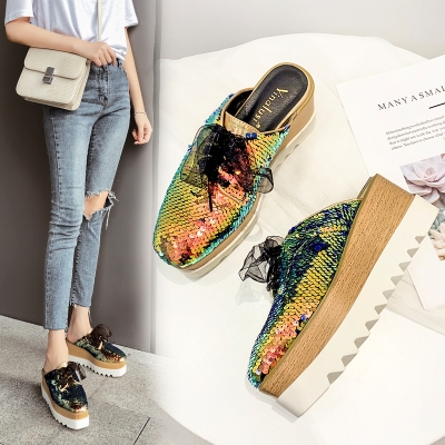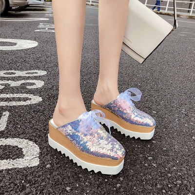 Korean version of the thick-soled platform shoes women's head British fashion Baotou back empty half slippers all-match sequins lazy drag