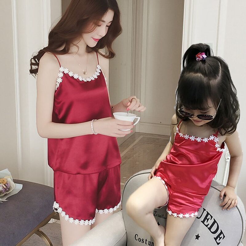 Summer Pajamas Ladies Casual Sling Thin Section Sexy Ice Silk Girls Pajamas Pants Set Mother and Daughter Parent-Child Homewear