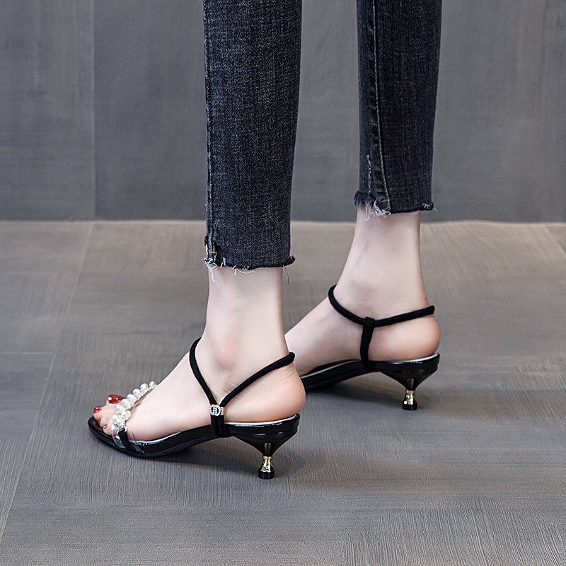 3cm pearl sandals women's 2020 new Xiaoxiangfeng word with high heels women's stiletto low-heeled shoes with skirts