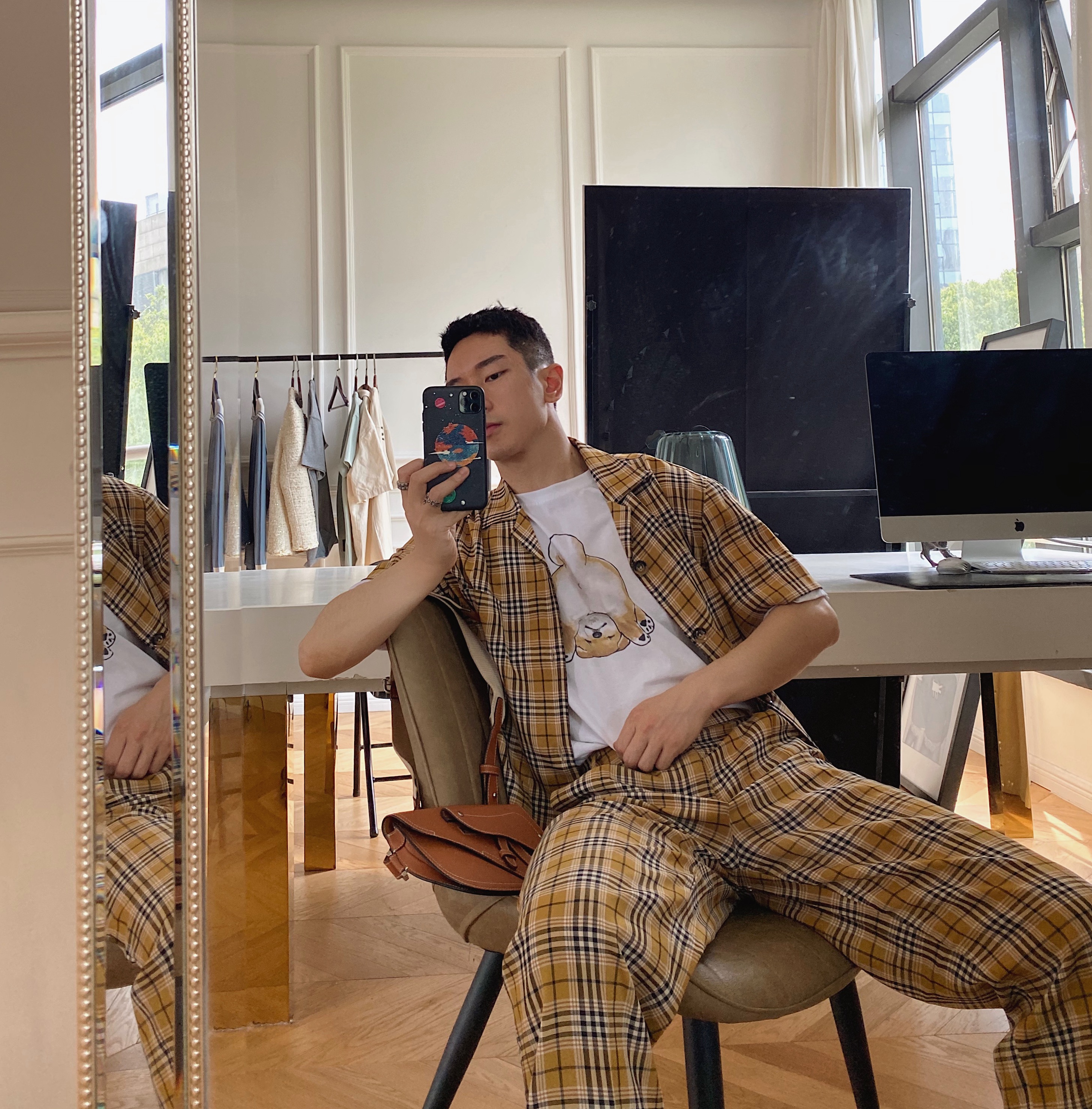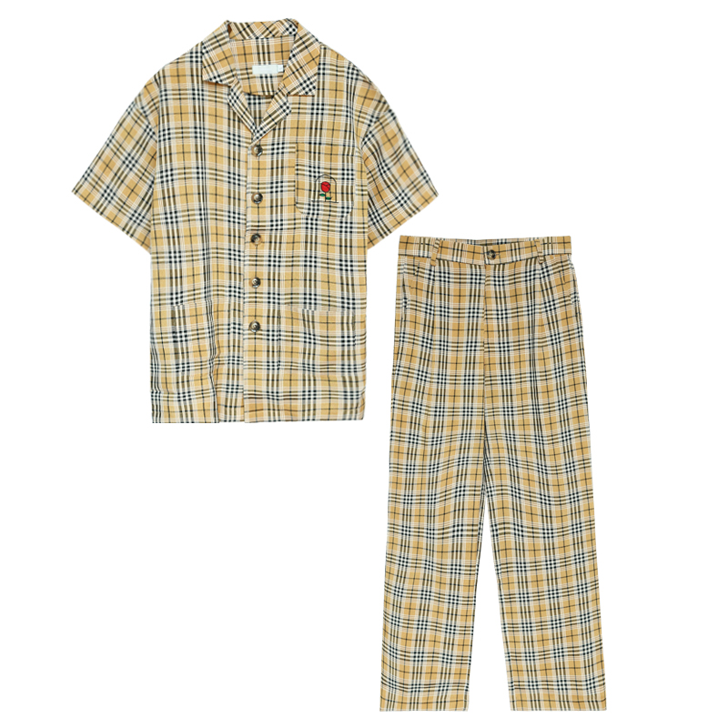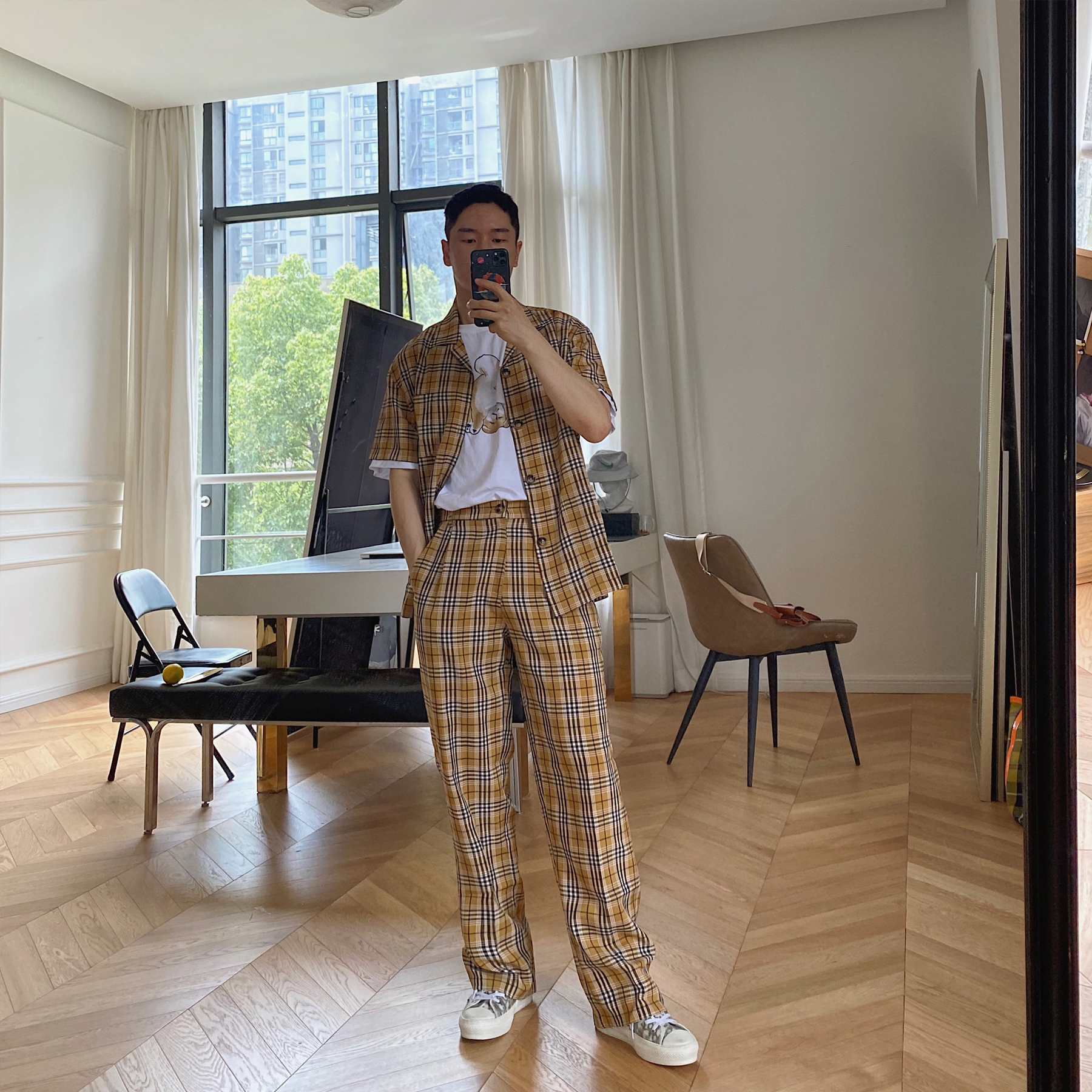 24KHOMME summer gao class trend ins plaid short sleeve shirt men Korean loose casual pants two-piece set
