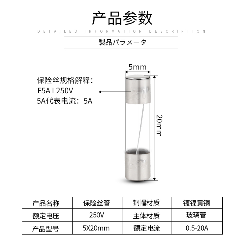Glass tube fuse 5x20 fuse fuse fuse 5a 10a 20A 20A l250v insurance tube f2a