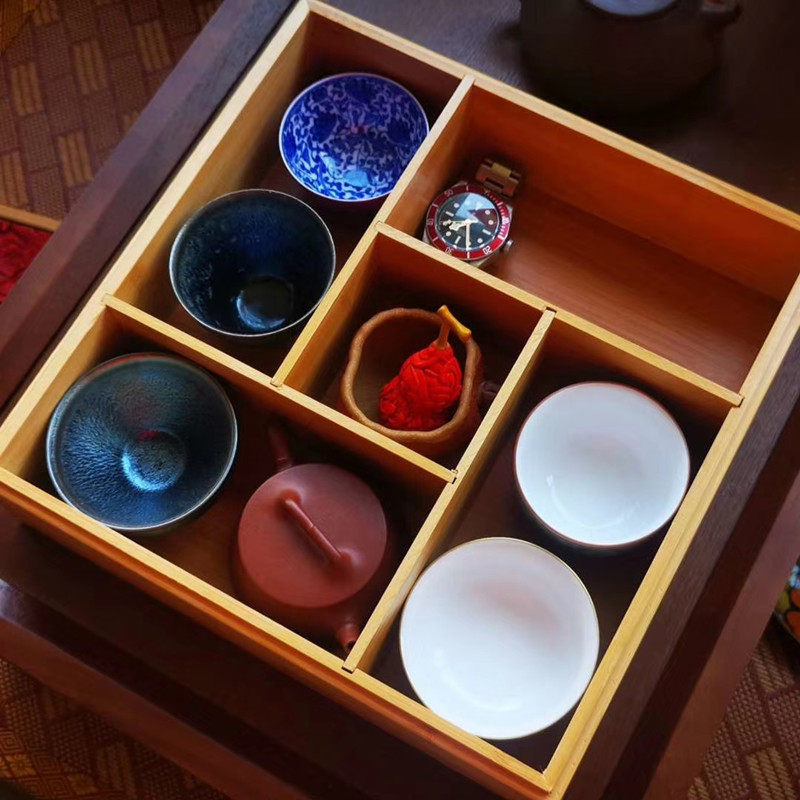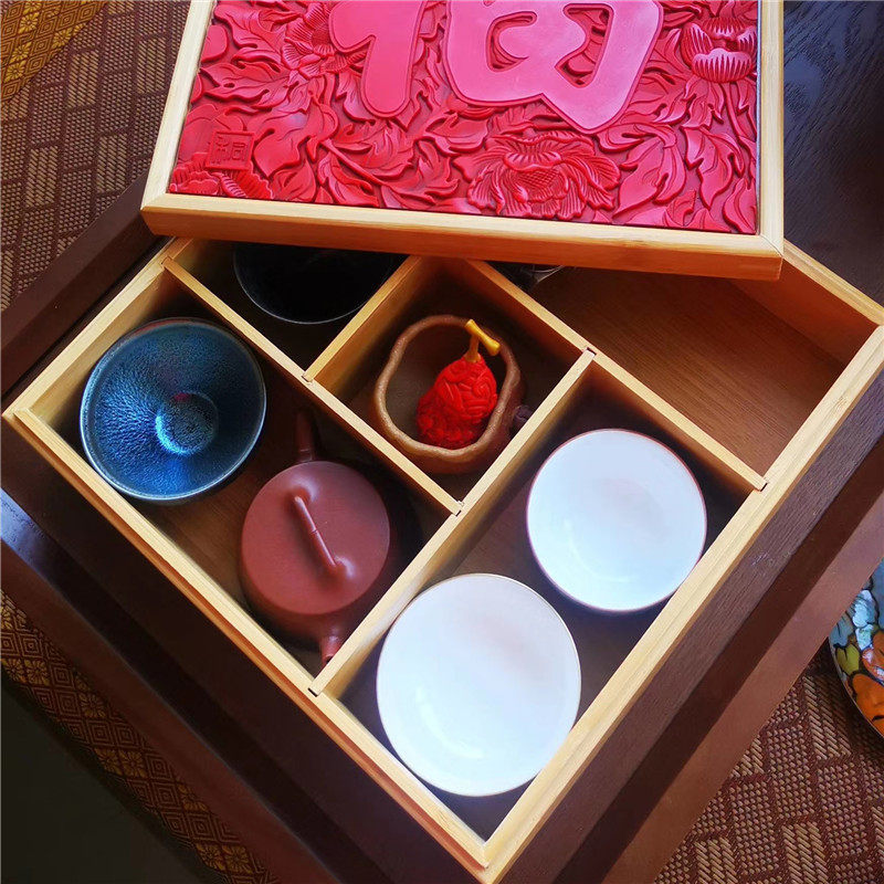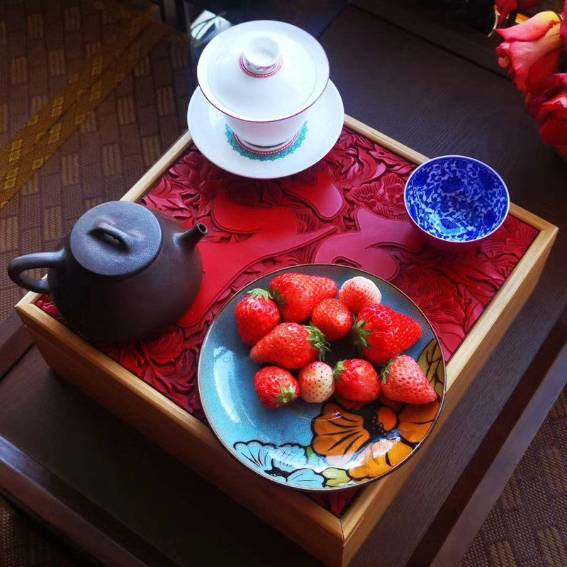Chinese retro flower blooming blessing lacquer carving Dry tea tray storage box Solid wood bamboo lacquerware tray Wooden lacquer