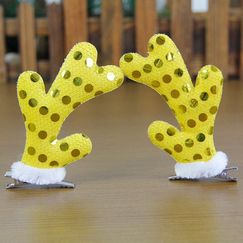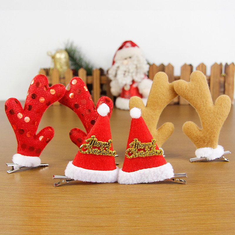A pair of bells and antlers hair clips, a pair of yellow antler hair clips, a pair of red sequin hair clips, a pair of snowflake hair clips, a Christmas hat hair clip, a pair of yellow sequin hair clips