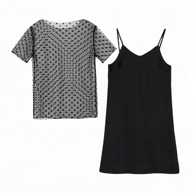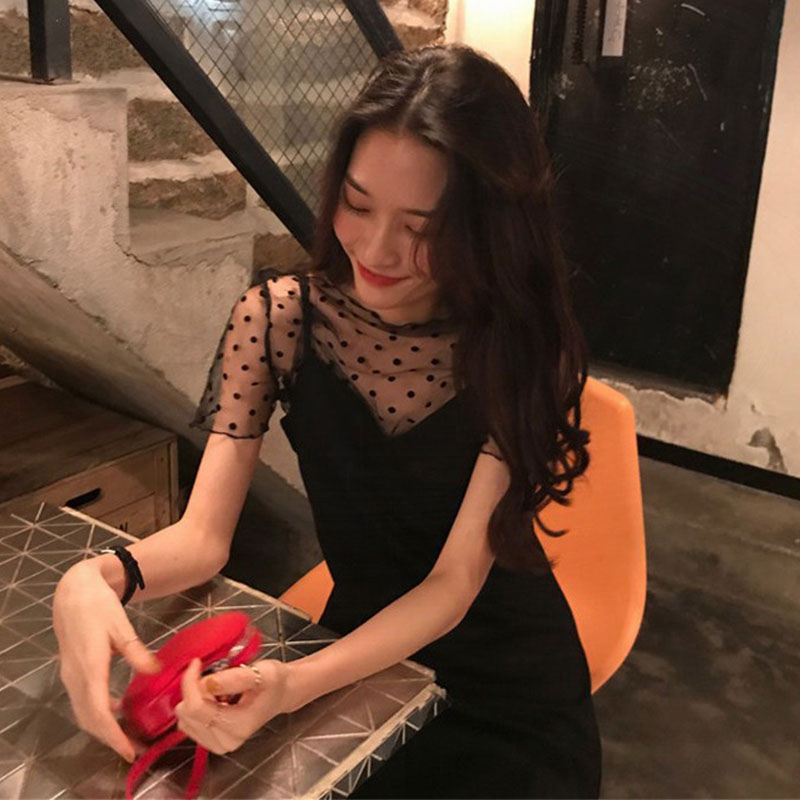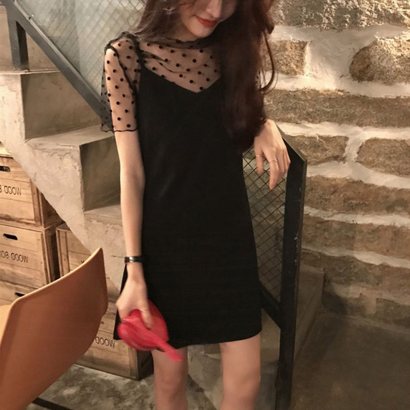 Black Pendant Strap Skirt Woman Summer 2022 new short Article Body Slim Sexy Net Veil Fairy-style Two-style Dress Dress