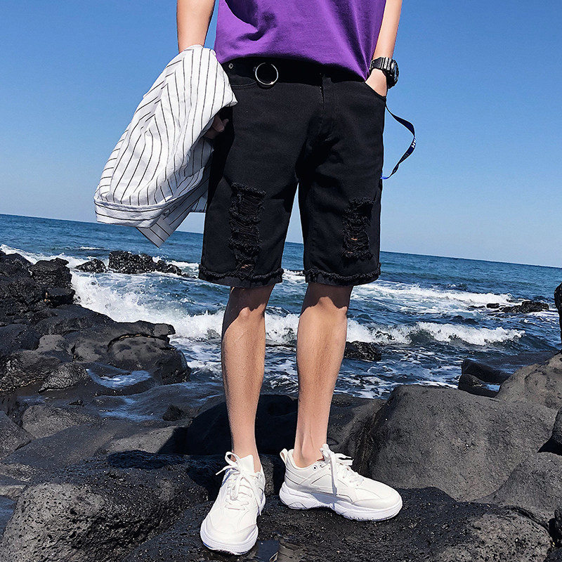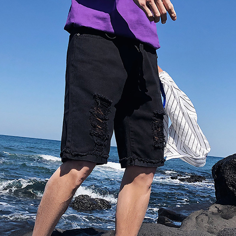 Broken Hole Cowboy Shorts Men Summer Thin straight drum Loose Tide Cards Nets Red 50% Pants Trendy Korean version 100 lap
