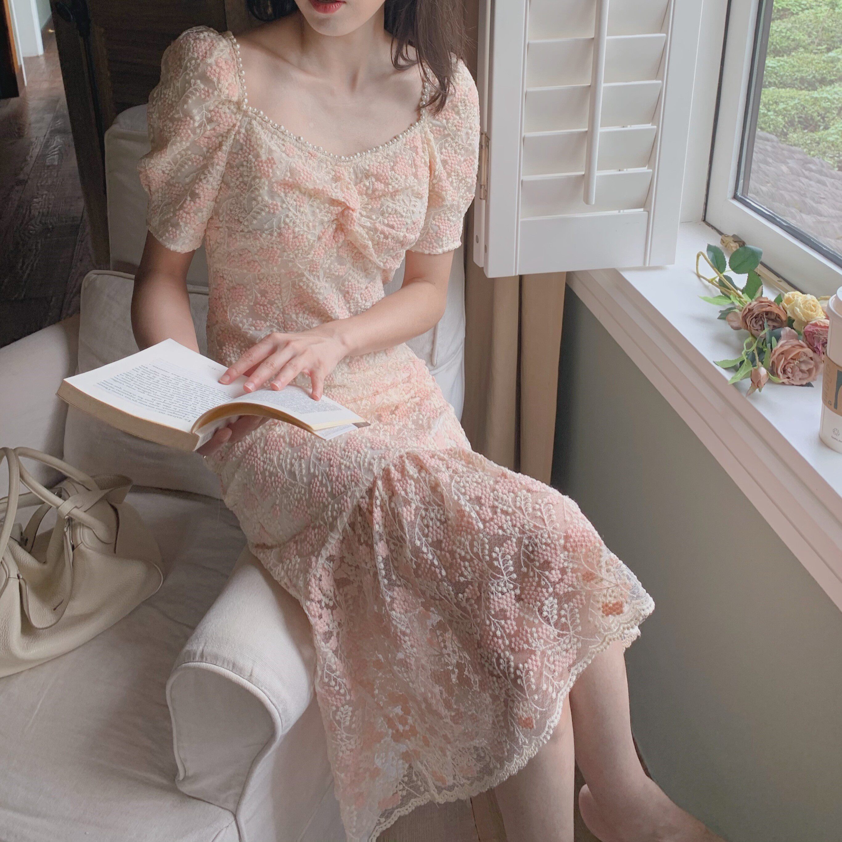 From a crowdsourced lunar stereo embroidered floral dress with a female summer gentle wind pearl floral edge V pilottail skirt