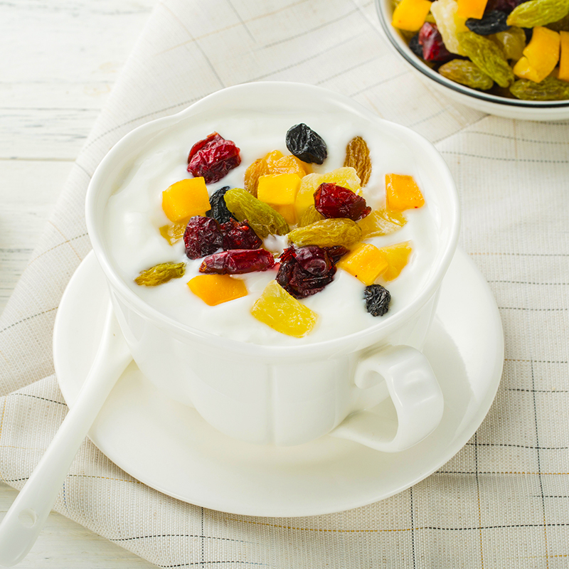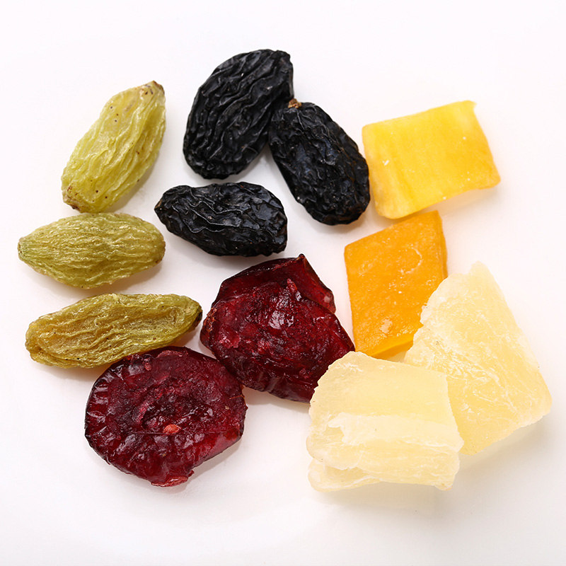Dried cranberry, dried mango, dried pineapple, dried green raisins, blackcurrant raisins