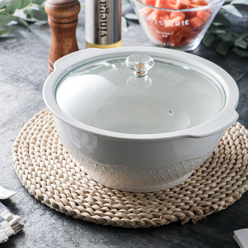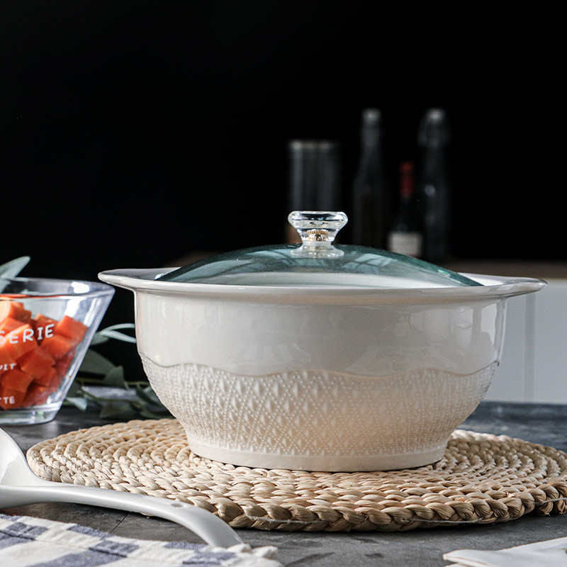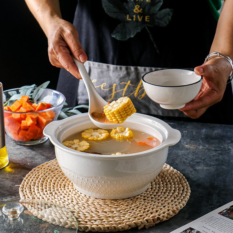 New creatives use double ear ceramic soup bowl 8 inch personality microwave tableware tableware with covered soup - shaft to send a large spoon