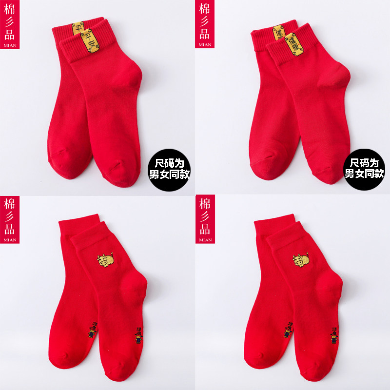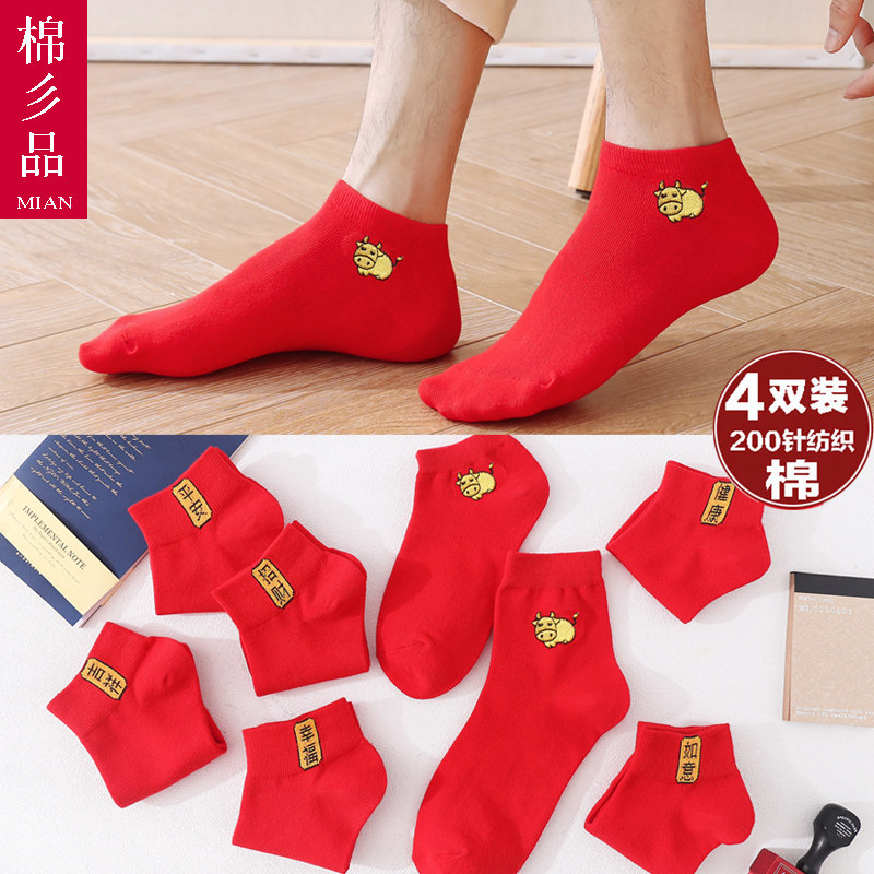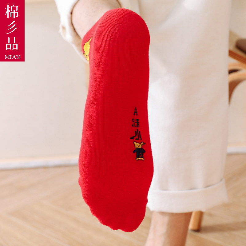 This year's big red men and women's cotton socks step on the villain Pure cotton blessing word Festive red socks Wedding gift short tube belongs to the cow