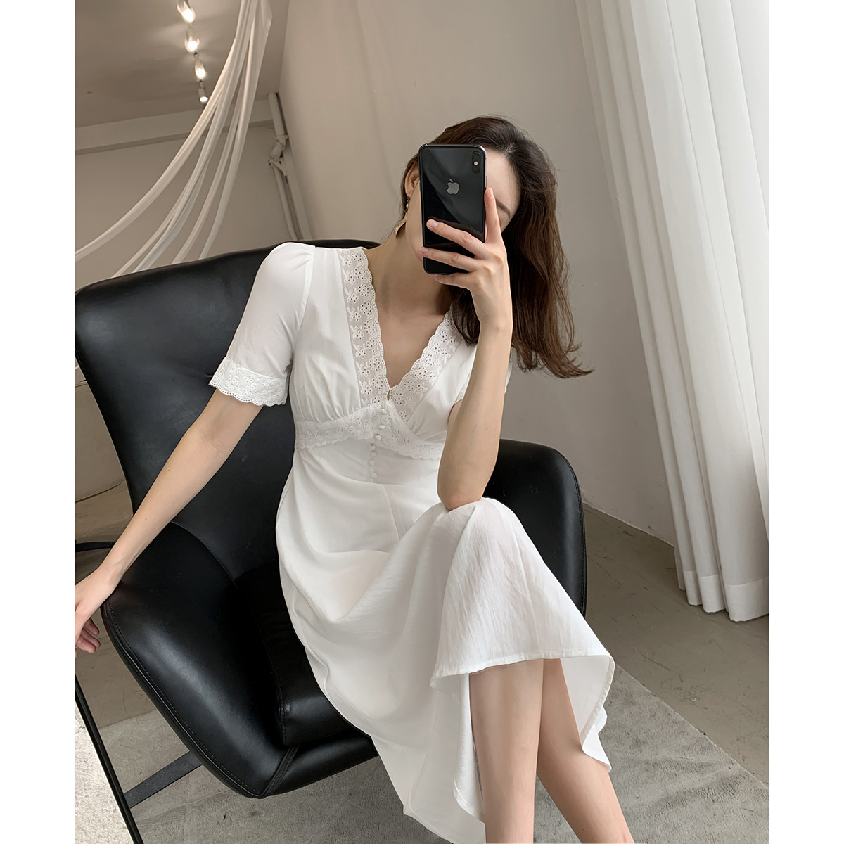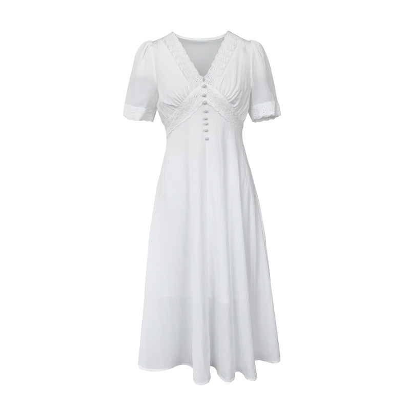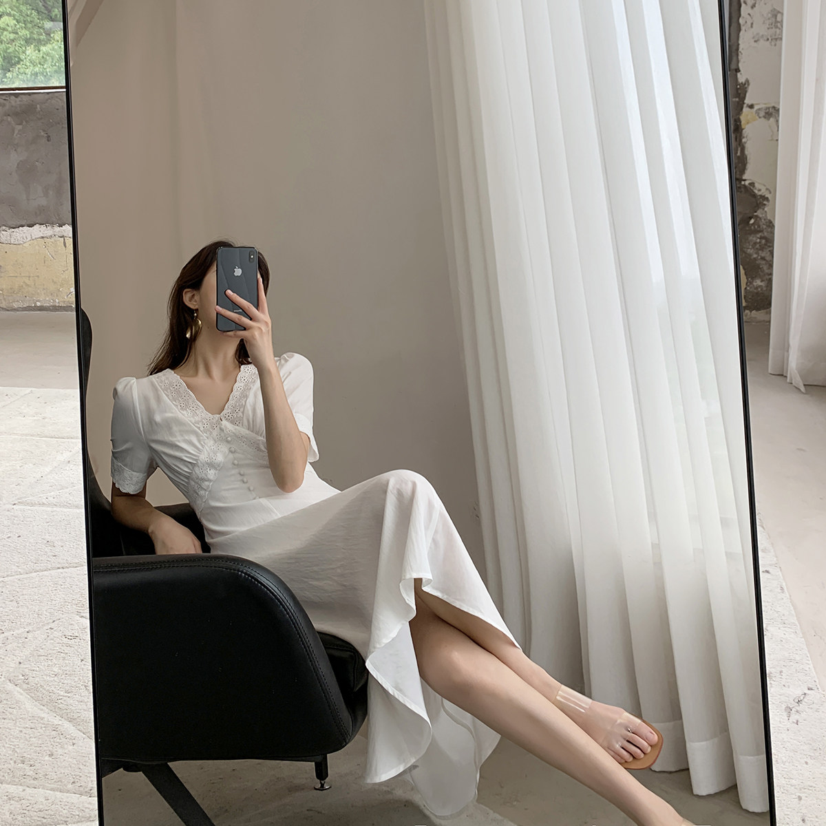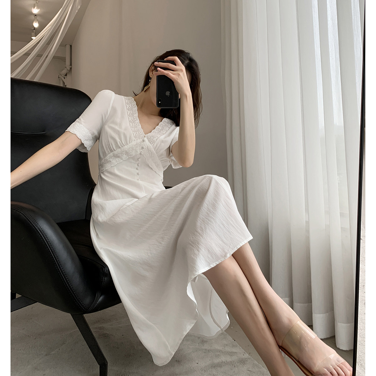 FT GUOGE white dress woman 2022 Summer new V collar short sleeves Gentle Wind style Slim Medium Long Dress