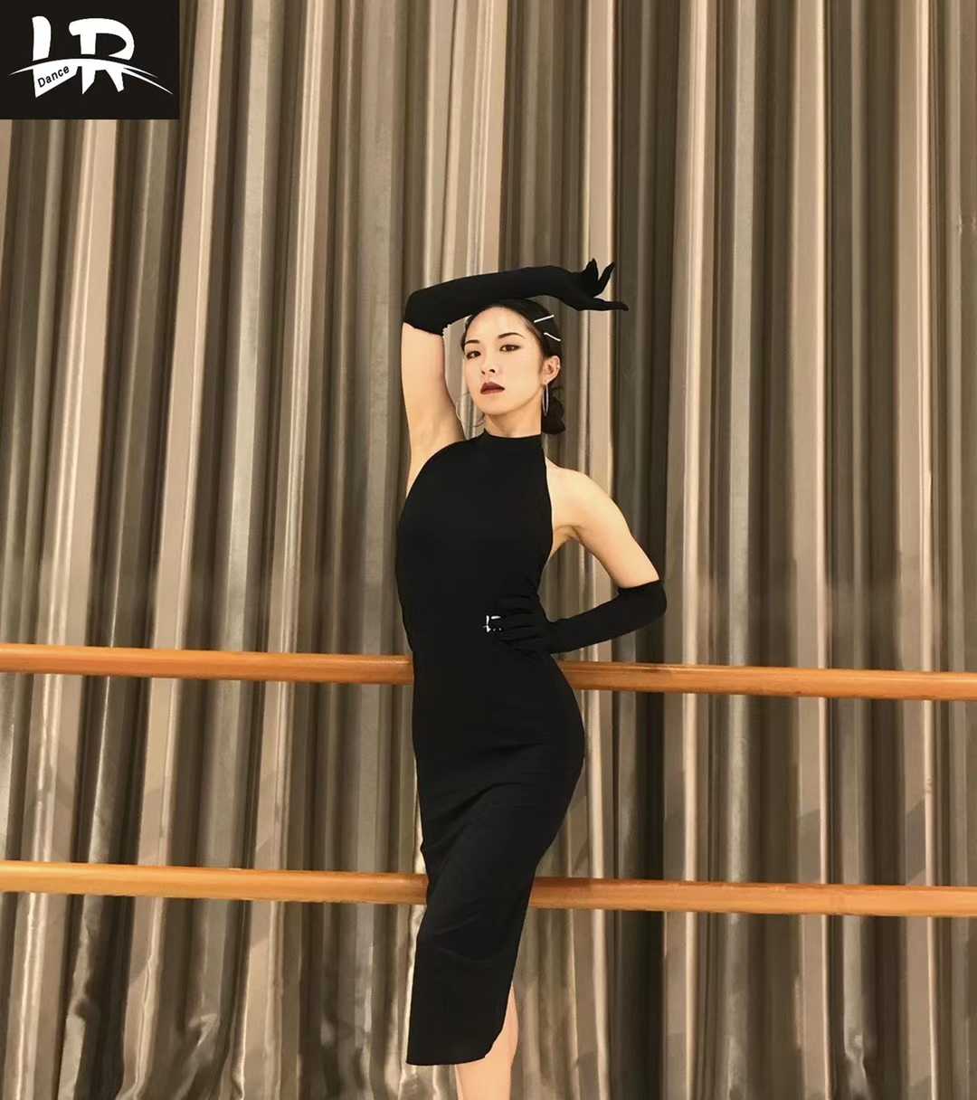 Wei Wei dance clothes, hanging neck and showing thin backless dress with gloves, chest pads, safety pants, Latin dance training clothes