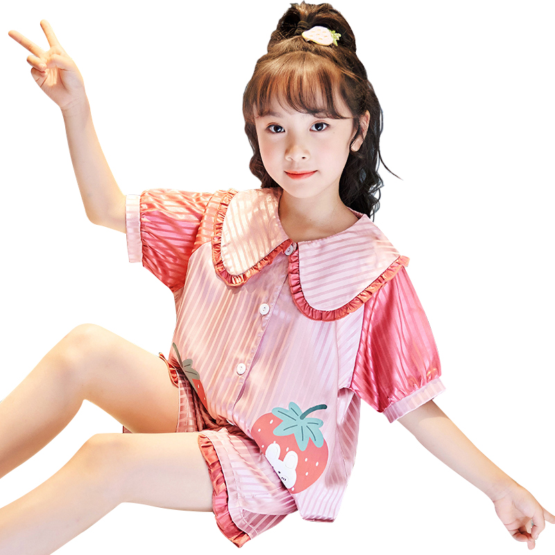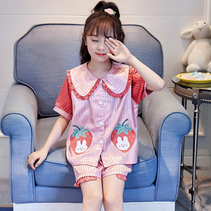 Girls' pajamas summer day thin ice silk short-sleeved children's loungewear in the big kids net red strawberry cardigan set