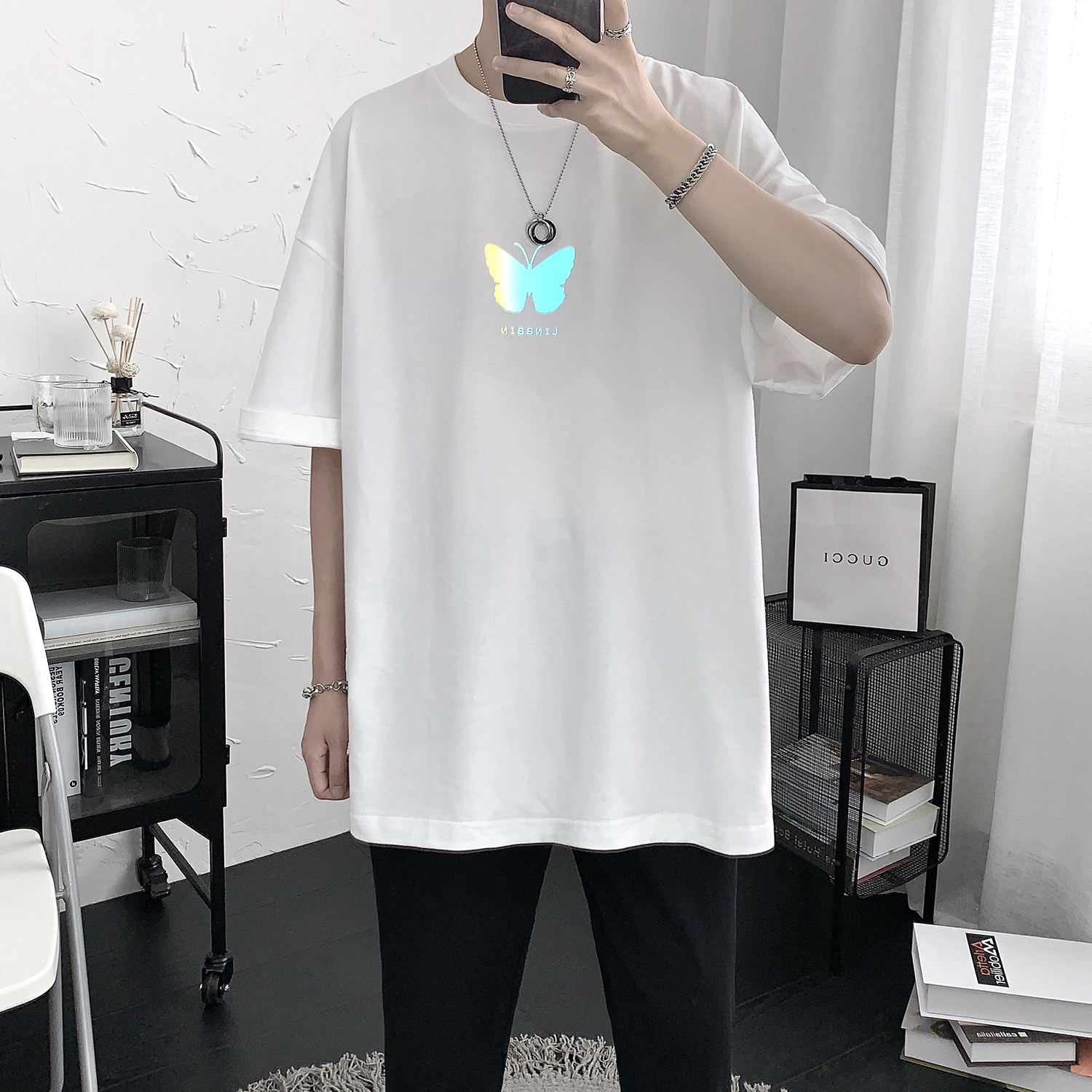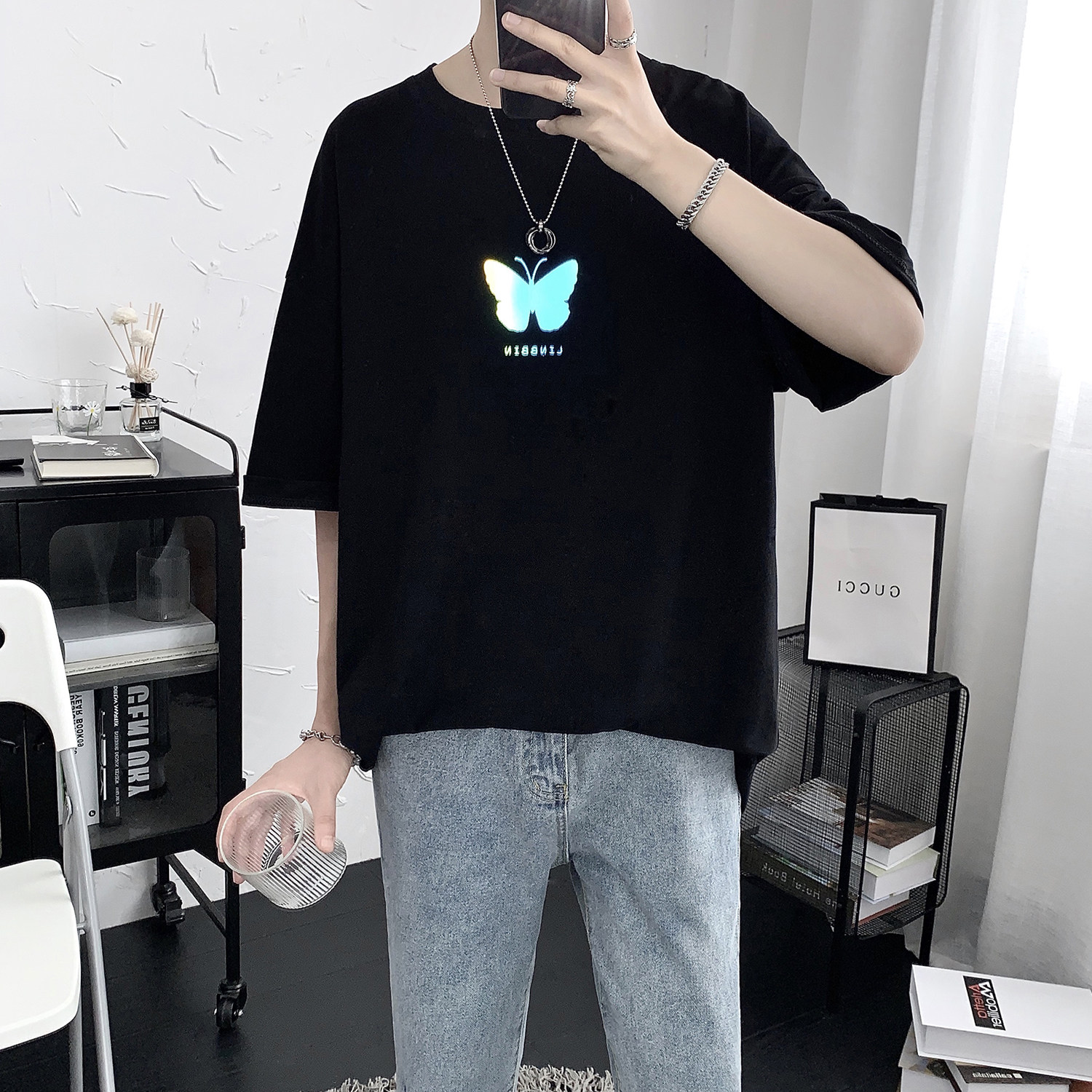 Men's clothing 2021 new summer reflective butterfly printed short sleeves T-shirt male tide card trend easing ins 100 hitch