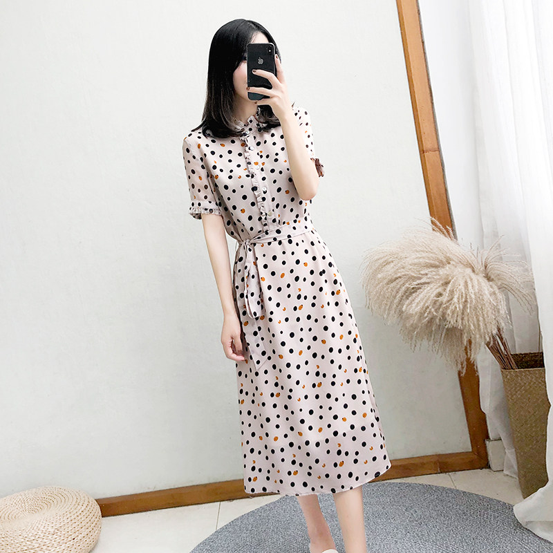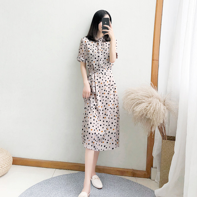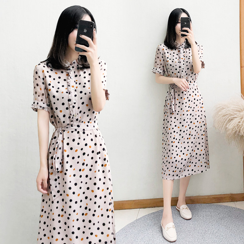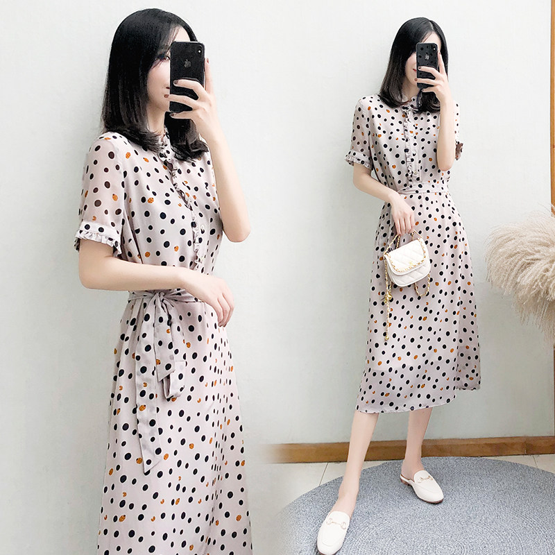 2023 new women's summer mid-length short-sleeved polka-dot dress female waist slimming chiffon long skirt