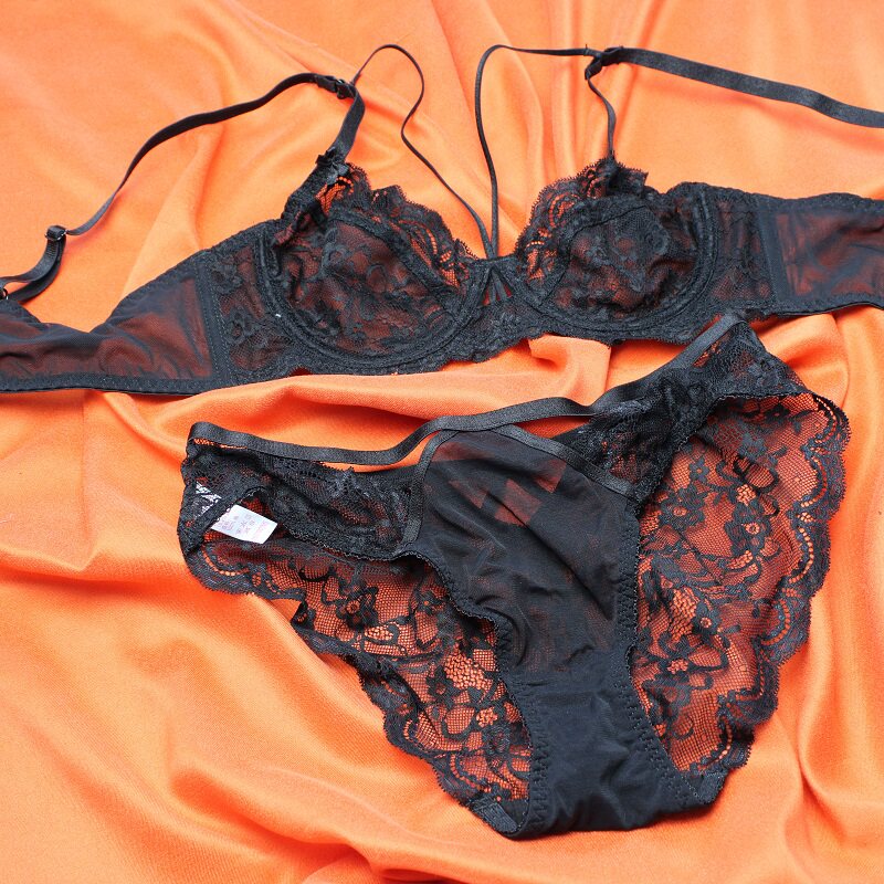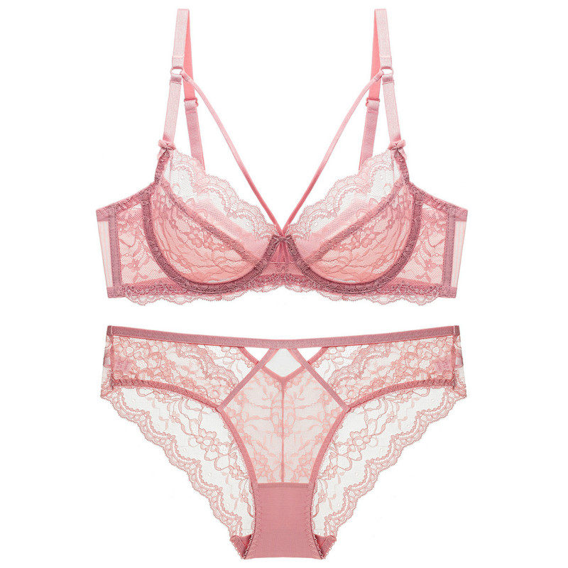 European and American new ultra-thin girl sexy French lace underwear transparent mesh sweet bra set big size shows small