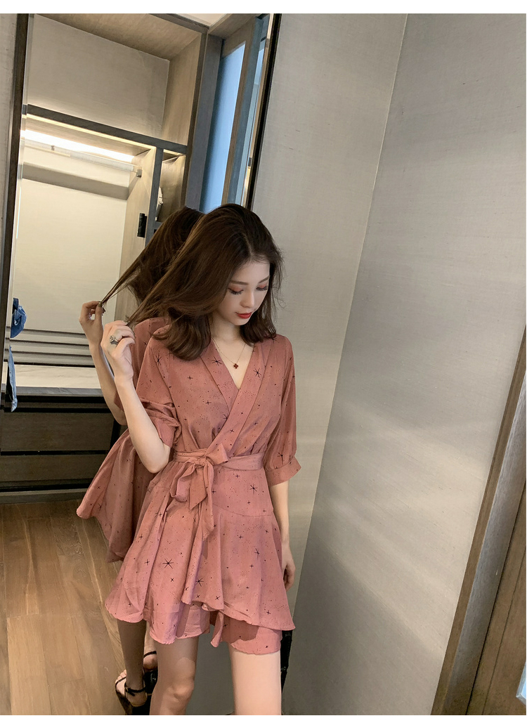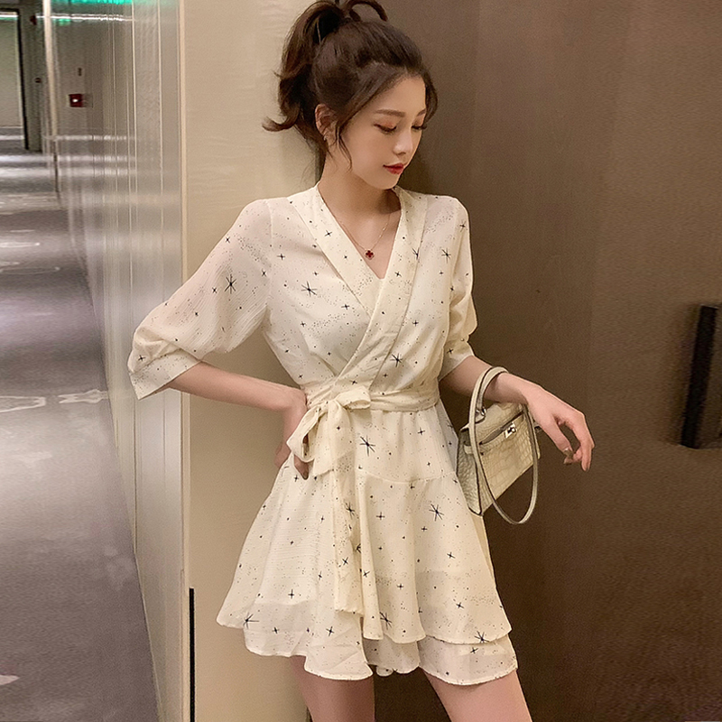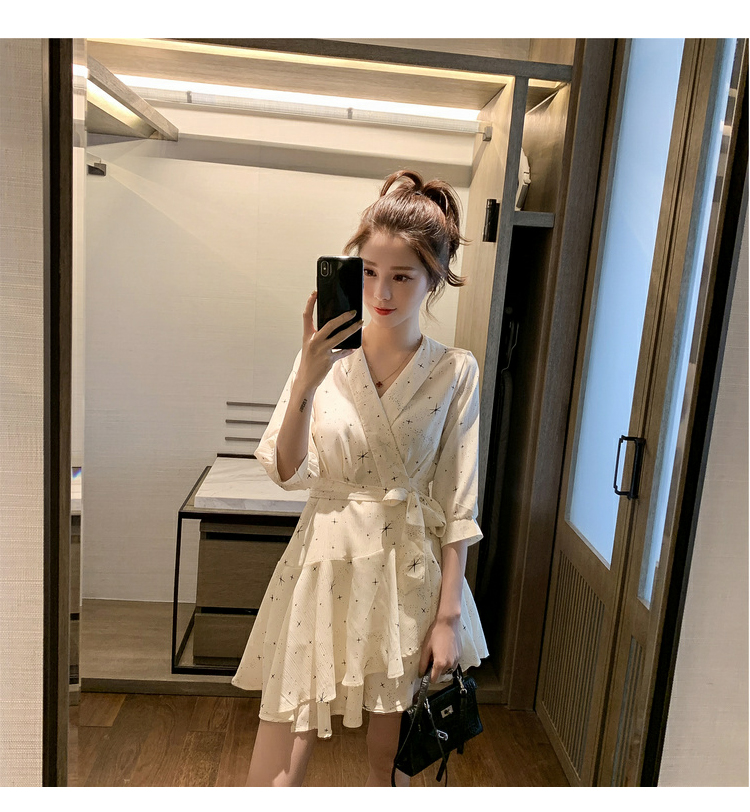 Snowspun Ocean Dress Woman 2022 Summer New Korean version V collar lacing collection waist small sub-display slim lotus leaf side skirt