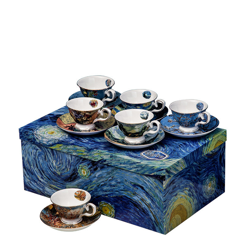 English style 4 Sends Golden Cherry Blossom Spoon Star Air Gift Box Dress With Hand Bag TS Van High Cup Saucer 4 Pieces Send Golden Cherry Blossom Spoon Star Air Gift Box Dress With Handbag van Gogh English-style cup with 5 sets A for a golden cherry flower spoon