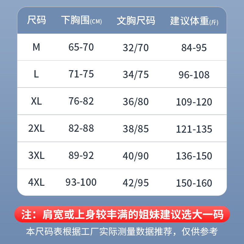M (suitable for normal bra wearing 32 70) L (suitable for bra wearing 34 75) XL (suitable for bra wearing 36 80) XXL (suitable for bra wearing 38 85)