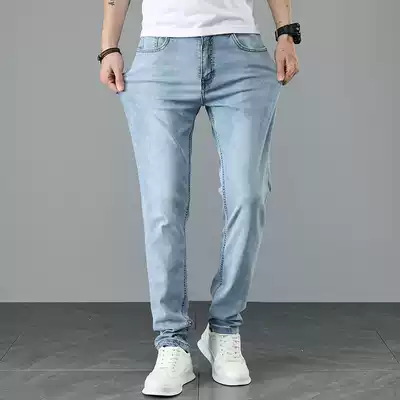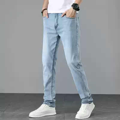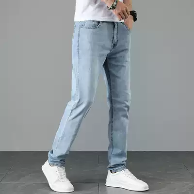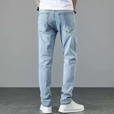 Autumn new cotton jeans men's slim straight tube light blue casual pants light color trousers spring and autumn trousers