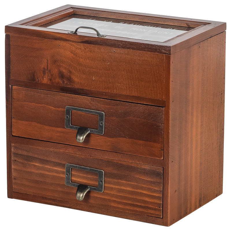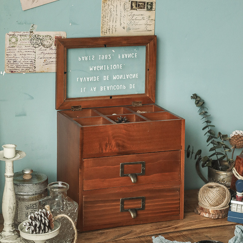 Wooden box retro glass ribbon flip cover jewelry storage box solid wood multi-layer drawer desktop storage box