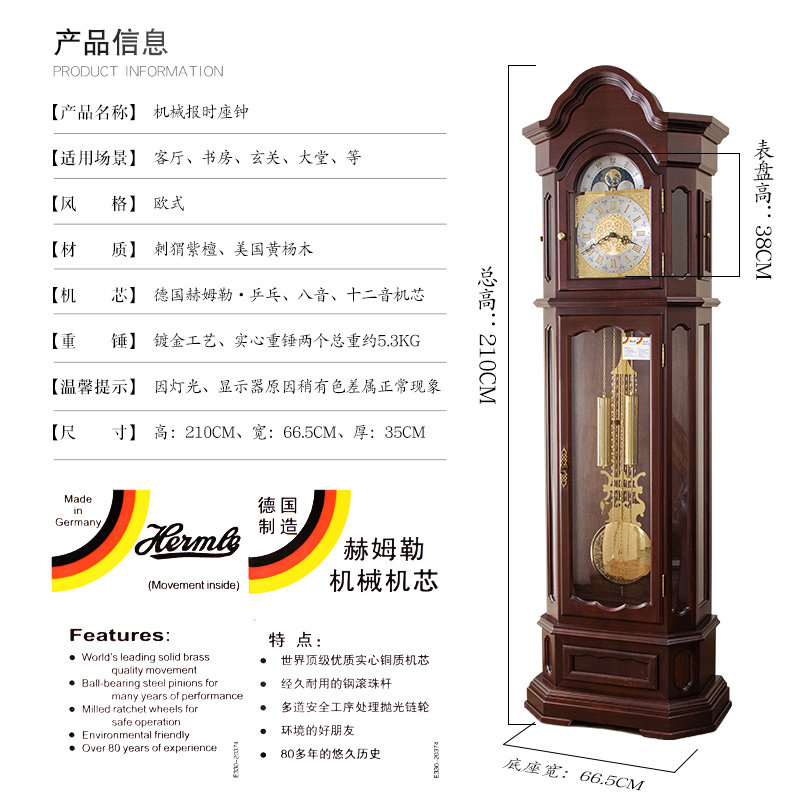 Germany Hemler mechanical floor clock European solid wood retro pendulum clock Living room classical clock timekeeping clock