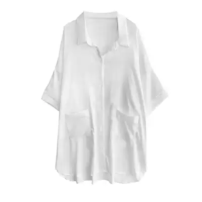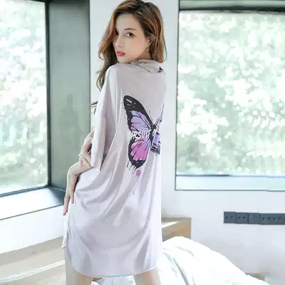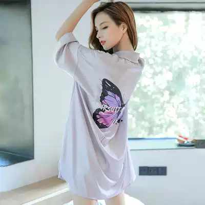 Net Red Butterfly nightgown women's summer ice silk shirt style pajamas medium and long version sexy loose large size silk home clothes