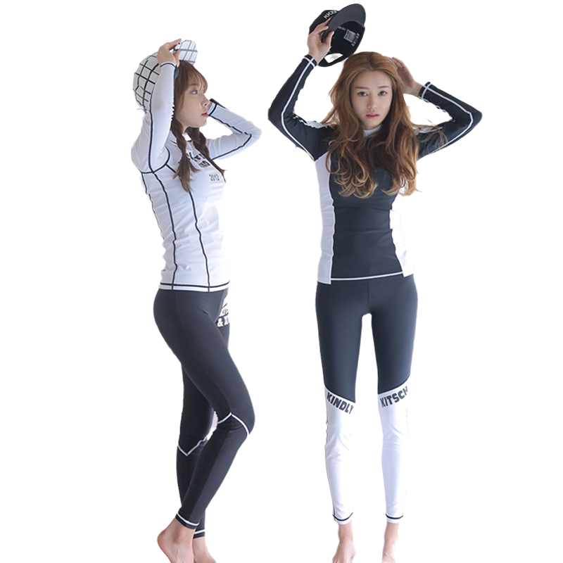 South Korean sunscreen long sleeve two-piece swimsuit women's black and white collage conservative high collar long pants with slim cover surf diving suit
