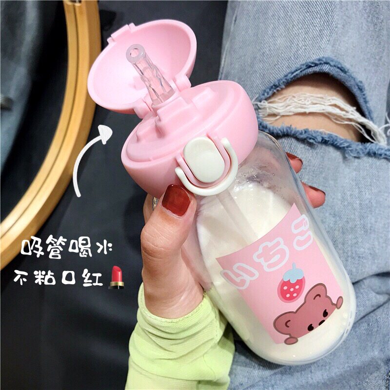 Ins cute cartoon straw water cup girl heart super cute fresh transparent glass Korean portable accompanying cup
