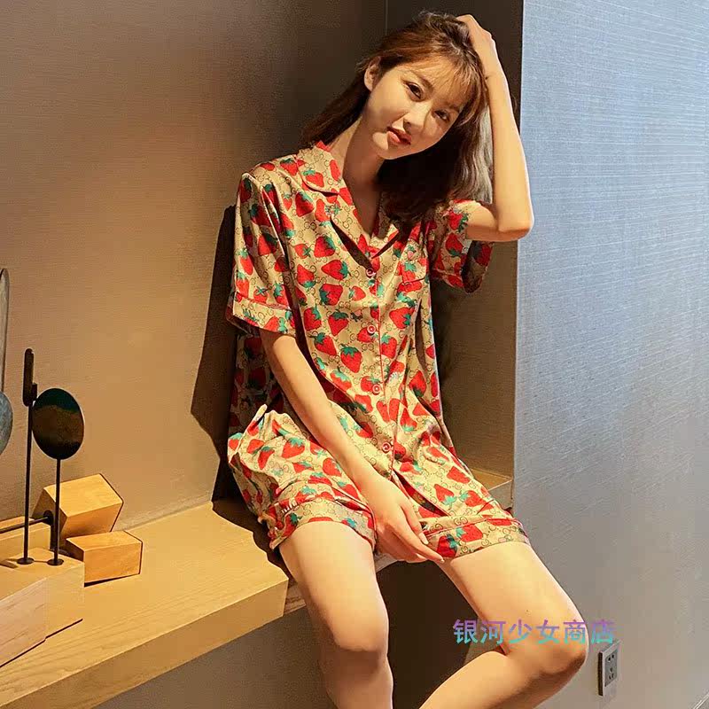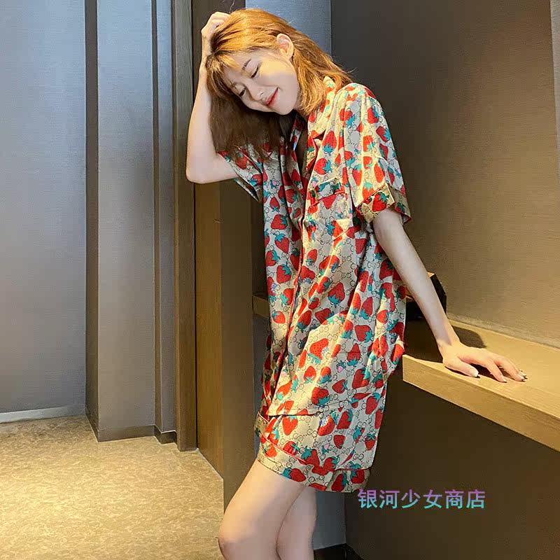 ins wind summer slim sleepwear woman short sleeve shorts Strawberry Genuine Silk Cute Two Suit Home Clothing Exo-Taobao