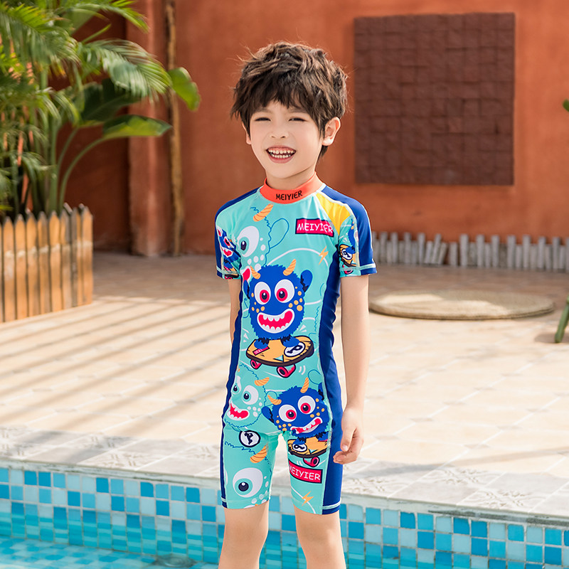 Children's swimsuit boys middle-aged children short-sleeved shorts split cartoon hot spring conjoined long-sleeved swimsuit boy