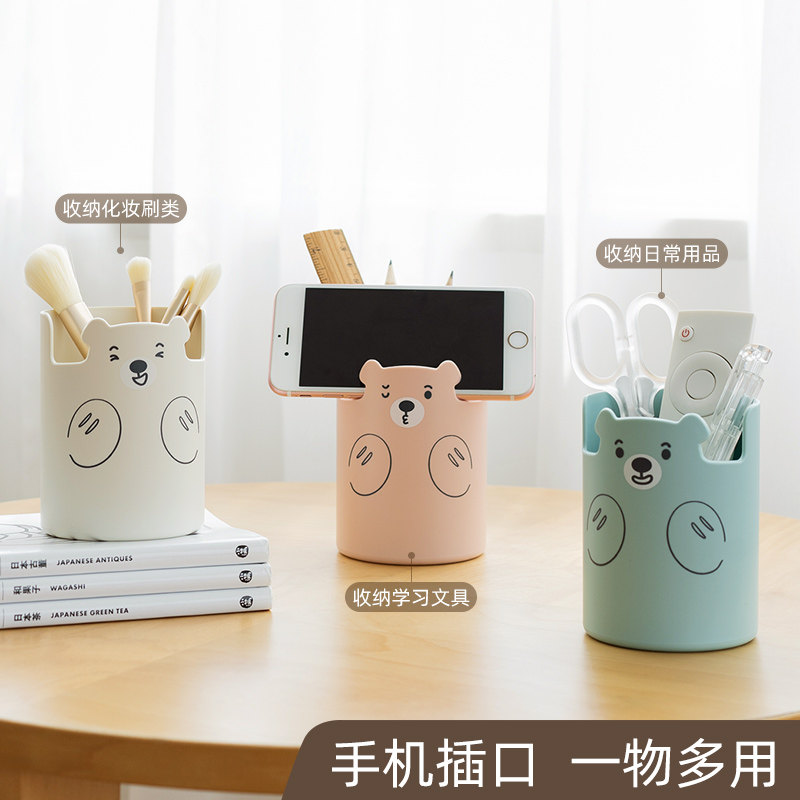 Free Bear Bear Pen Holder Female Girl Cute ins Japan Simple Modern Creative Desktop Storage Box Kids Boys Stationery Students Multifunctional Pen Bucket Large Capacity Office Pen Holder Gift