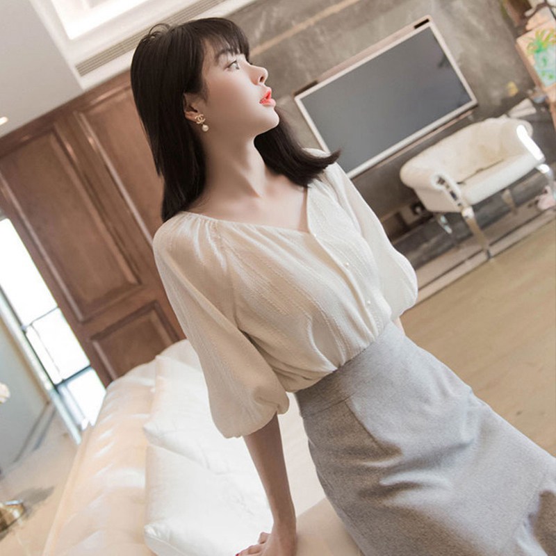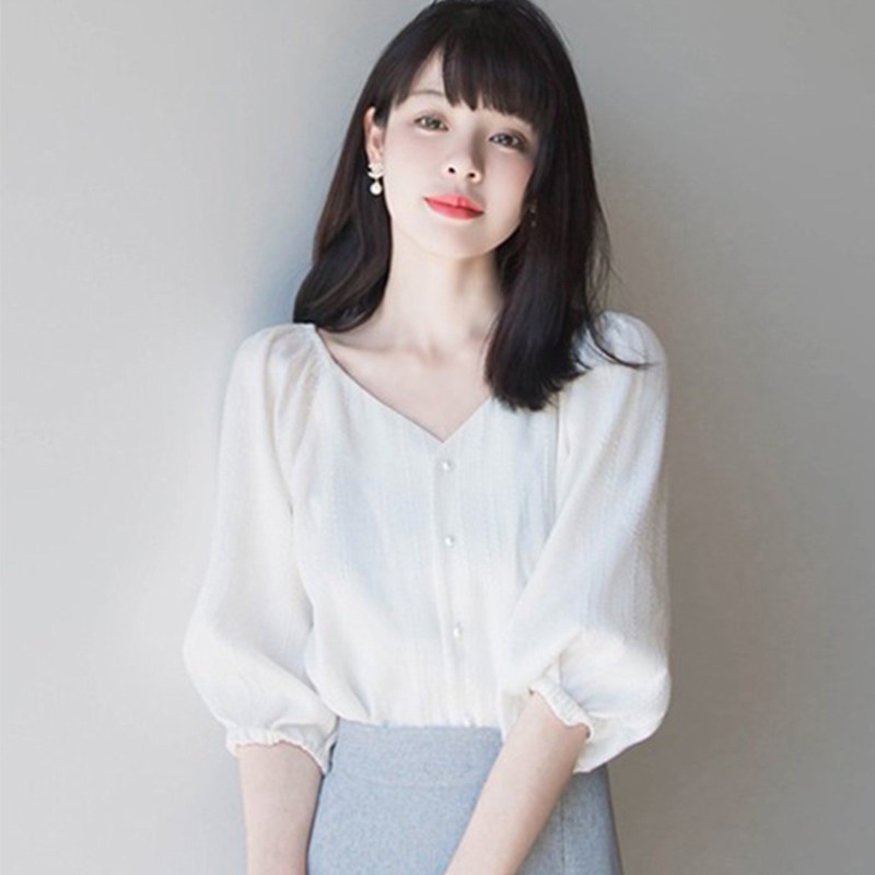 Chiffon shirt women's summer new design sense niche short-sleeved top light familiar V-neck Western style puff sleeve shirt summer