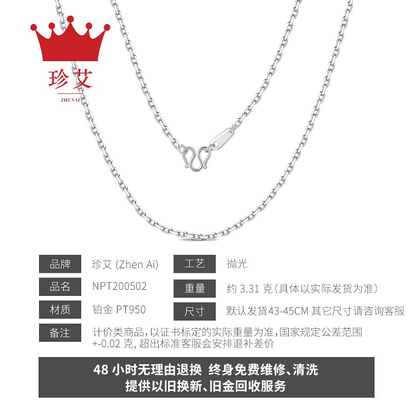 PT950 Platinum 2.88g (46cm) PT950 Platinum 3.18g (45cm) PT950 Platinum 4.12g (45cm) PT950 Platinum 5.83g (43cm) PT950 Platinum 5.94g (44cm) PT950 Platinum 6.22g (45cm) PT950 Platinum 6.64g (50cm) PT950 Platinum 7.92g (46cm) PT950 Platinum 8.71g (49cm) PT950 Platinum 8.58 g (44 cm) PT950 Platinum 9.74 g (45 cm) PT950 Platinum 10.54 g (49 cm) PT950 Platinum 10.01 g (50 cm) PT950 Platinum 11.52 g (48 cm) PT950 Platinum 13.12 g (51 cm) PT950 Platinum 17.69 g (52 cm) More gram weights and lengths, please consult customer service to purchase